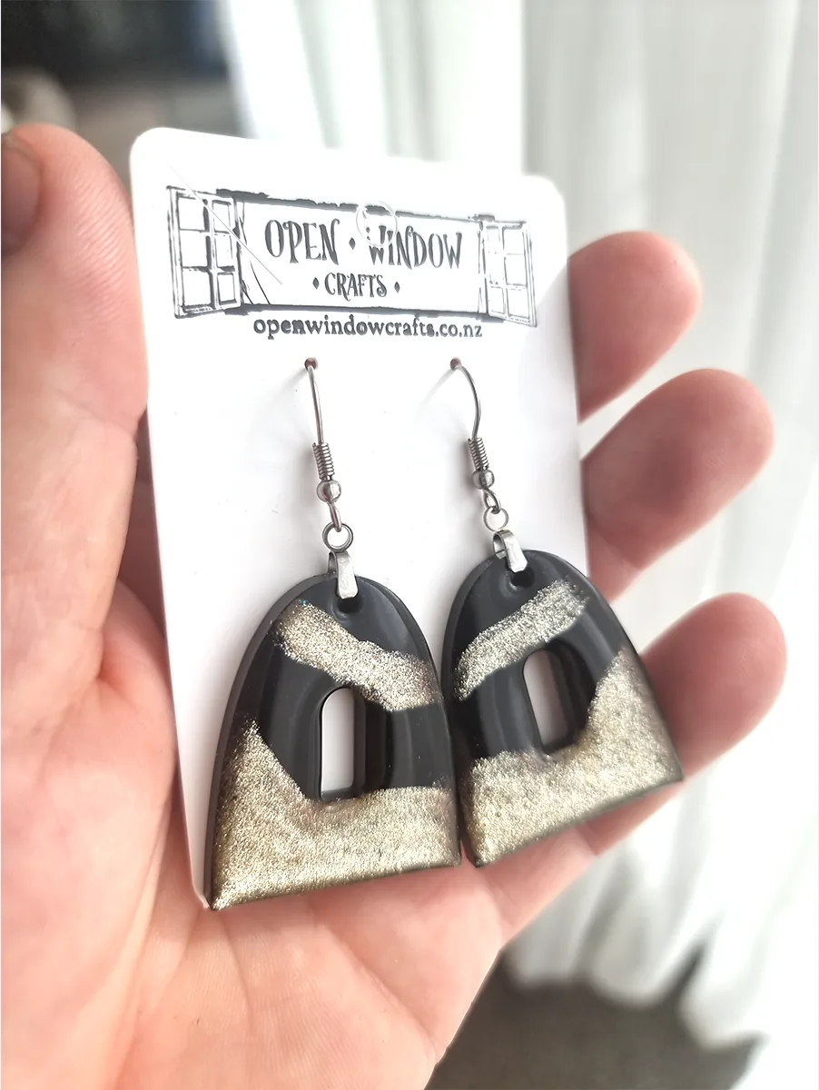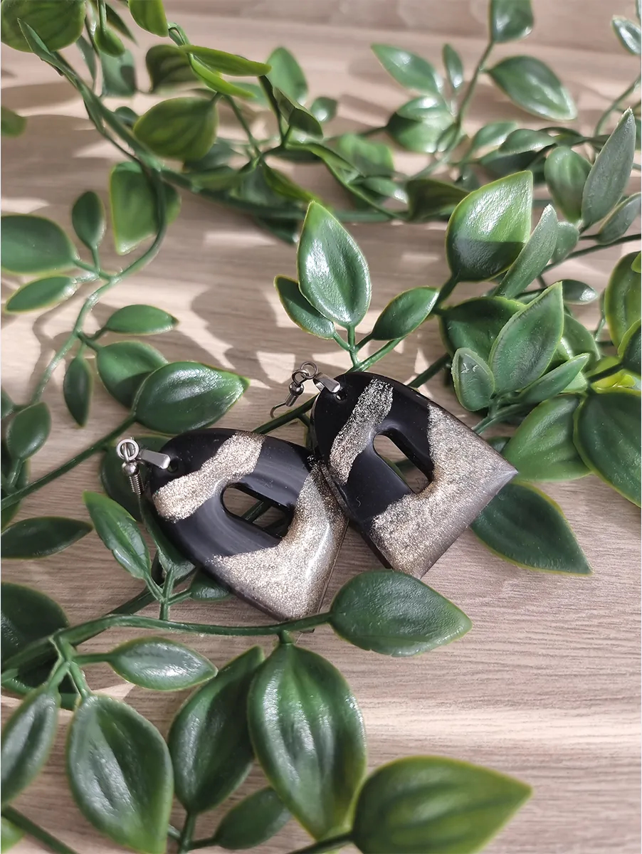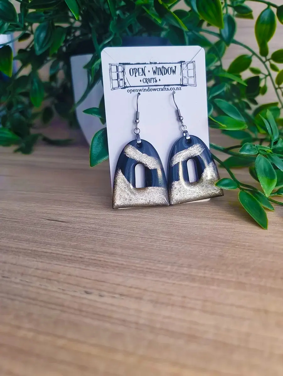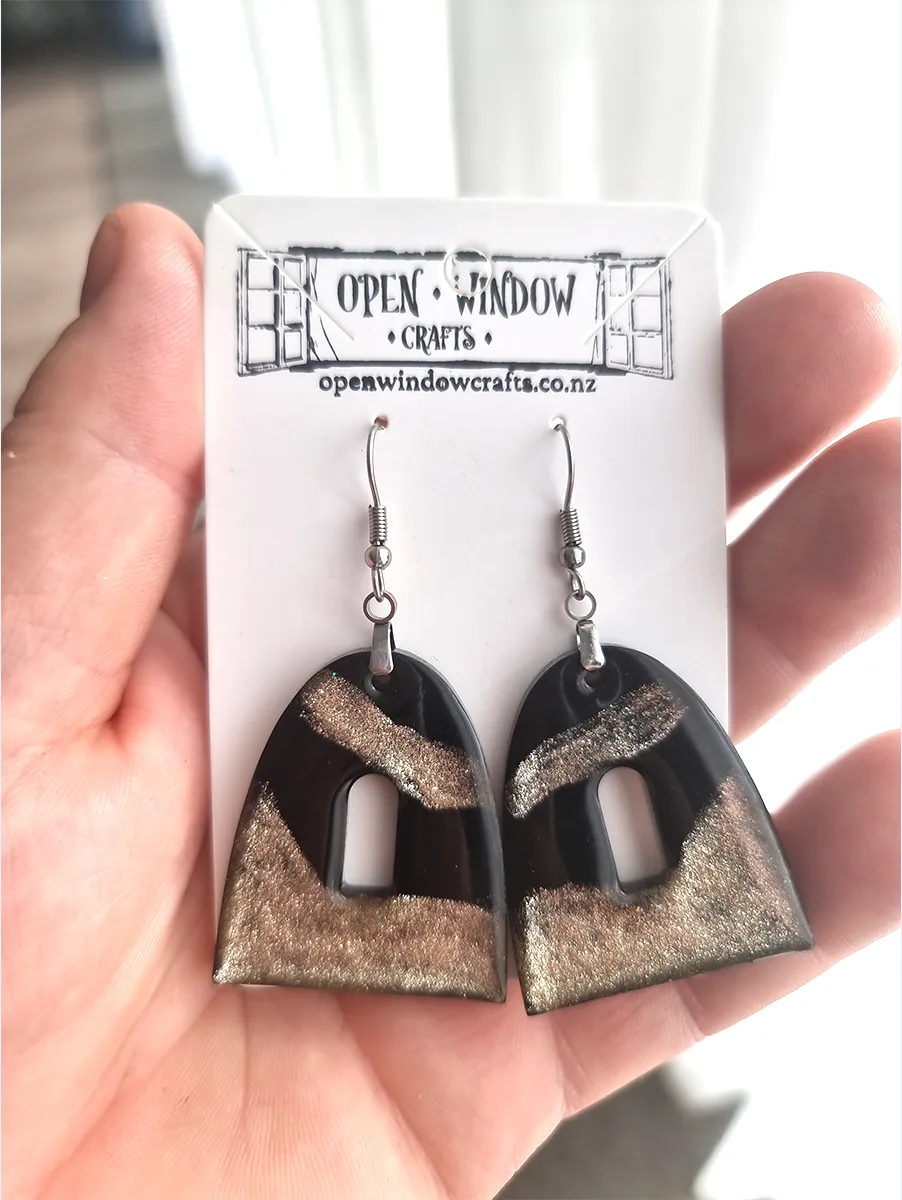 Black and Gold Glitter Resin Shaped Dangle Earrings