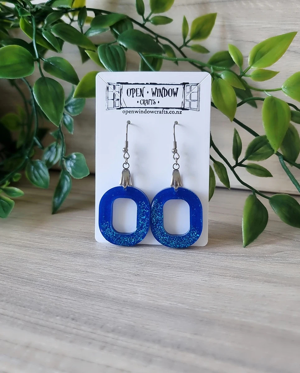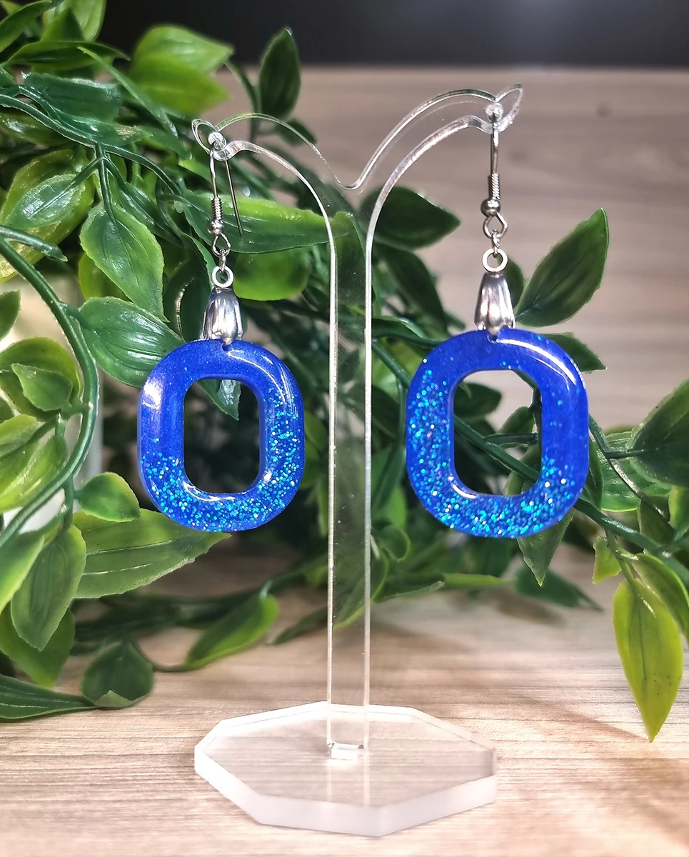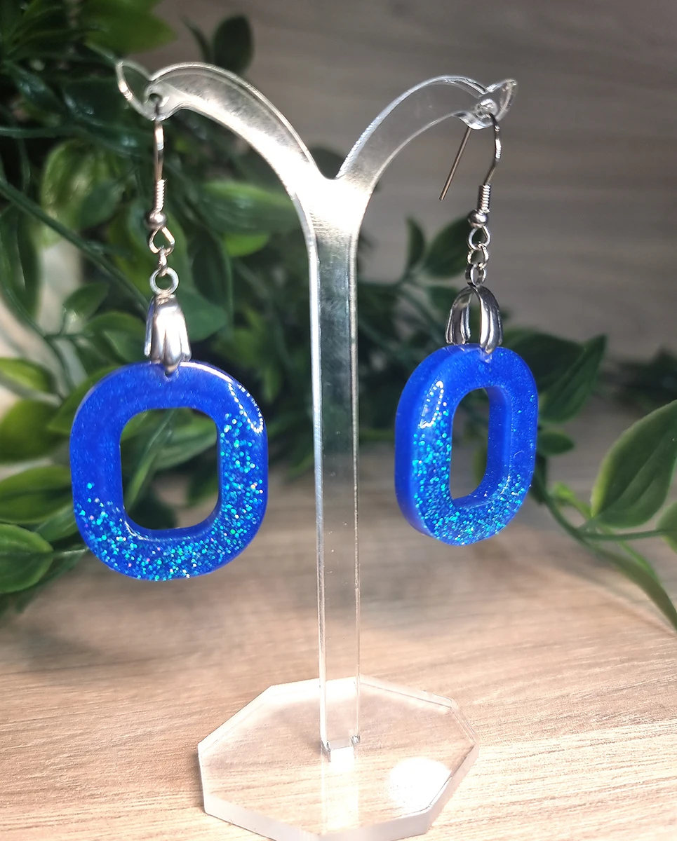 Add a touch of elegance and sparkle with our Blue Oval Glitter Dangle Earrings! These stunning earrings feature a sleek oval design in a vibrant blue shade, enhanced with shimmering glitter for extra shine. The lightweight dangle style creates graceful movement, making them the perfect accessory for both casual wear and special occasions. Handcrafted from high-quality resin, these earrings are designed for comfort and durability, bringing a bold yet sophisticated look to any outfit.