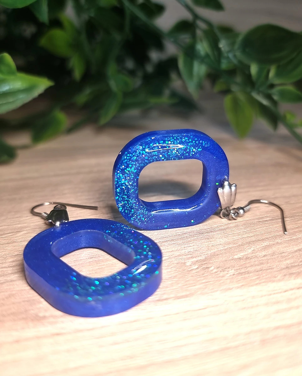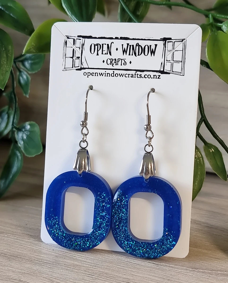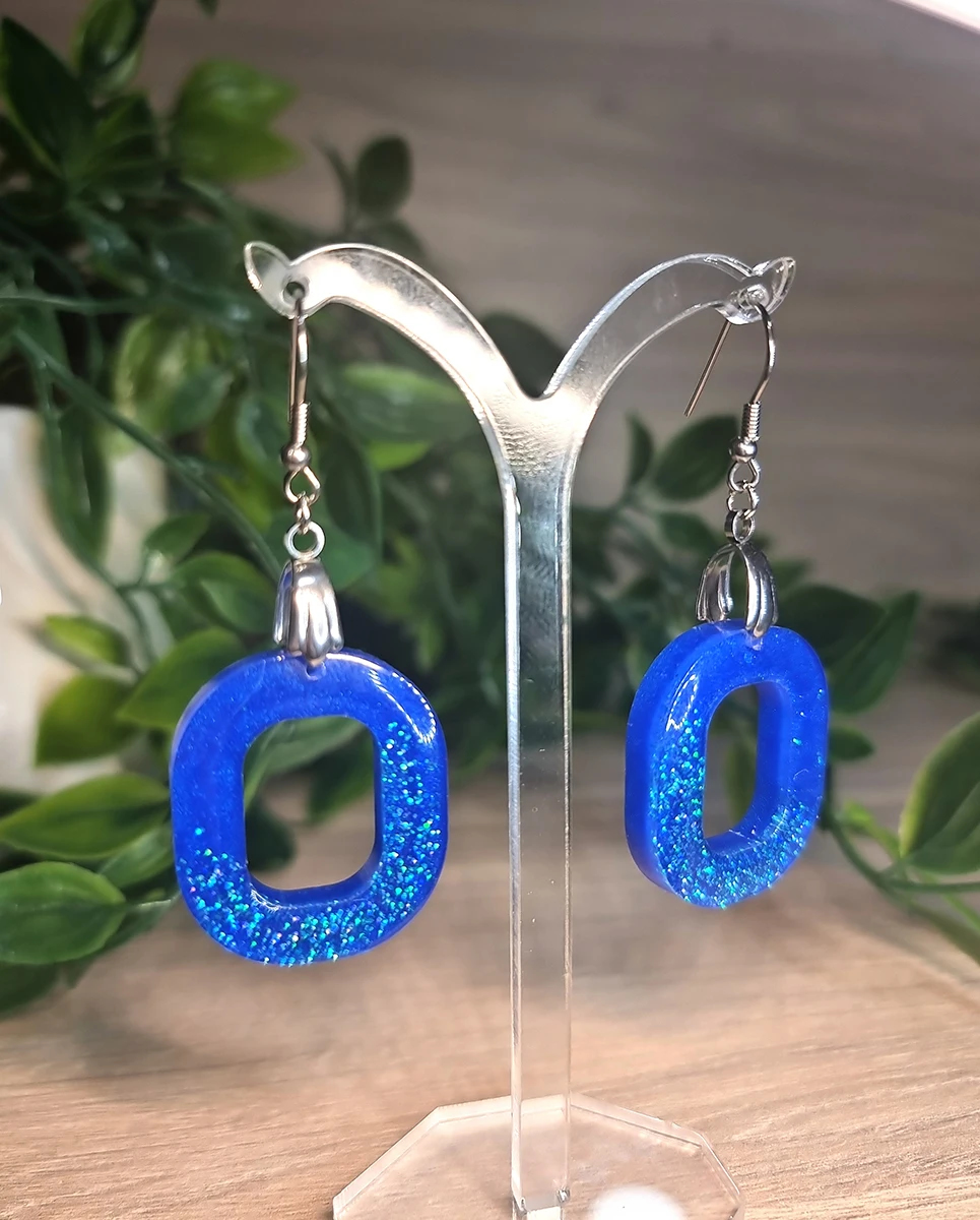 Add a touch of elegance and sparkle with our Blue Oval Glitter Dangle Earrings! These stunning earrings feature a sleek oval design in a vibrant blue shade, enhanced with shimmering glitter for extra shine. The lightweight dangle style creates graceful movement, making them the perfect accessory for both casual wear and special occasions. Handcrafted from high-quality resin, these earrings are designed for comfort and durability, bringing a bold yet sophisticated look to any outfit.