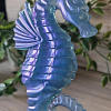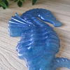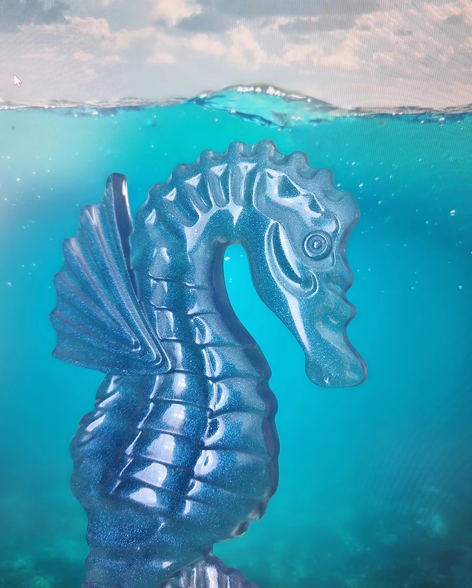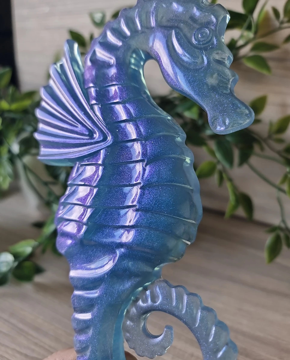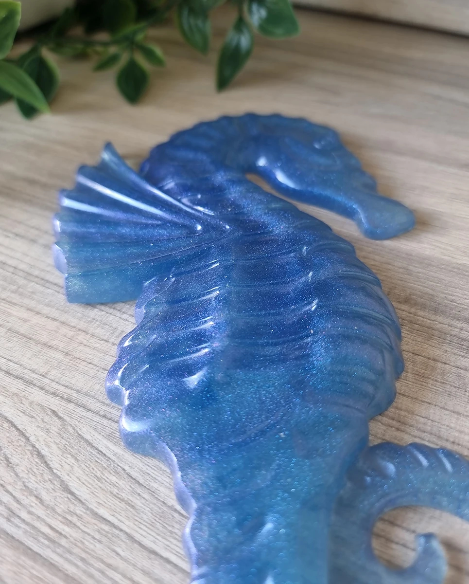 Enhance your space with this stunning Blue Purple Shimmer Resin Sea Horse wall art. Featuring a mesmerizing blend of blue and purple hues with a shimmering finish, this handmade piece brings a touch of oceanic charm to any room.
