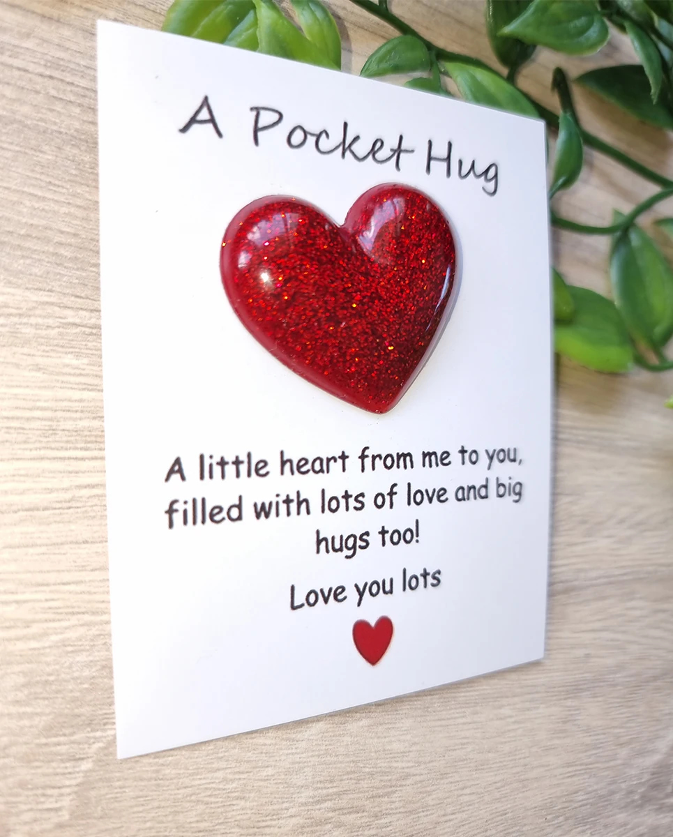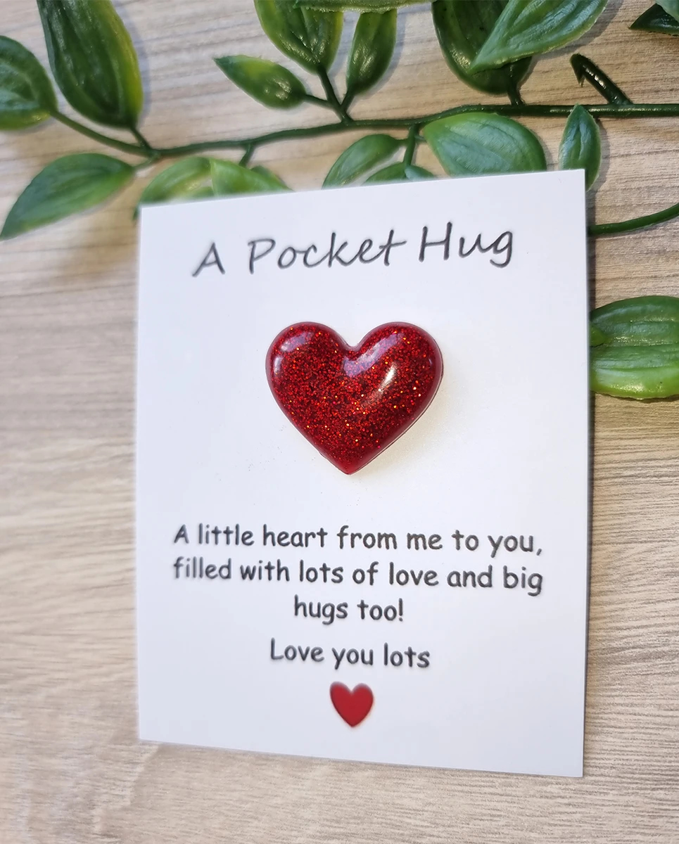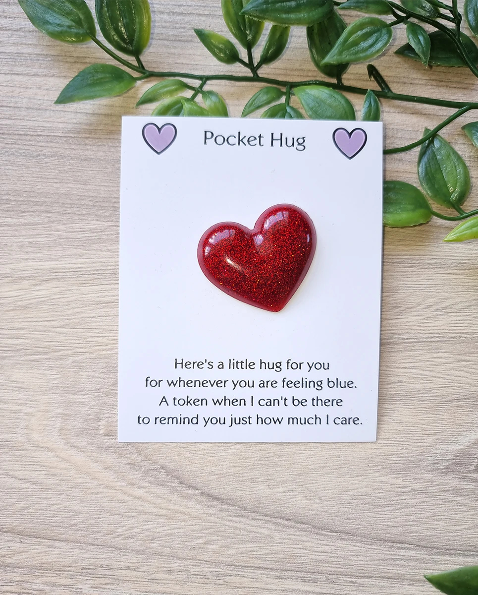 These Red Resin Glitter Pocket Hug Hearts are the perfect way to send a little love and comfort to someone special. Made from high-quality resin, each heart is infused with vibrant red glitter for a beautiful sparkle. Small enough to fit in a pocket, wallet, or purse, these hearts serve as a sweet reminder that someone is always thinking of you. Whether it’s for a friend, family member, or loved one, these charming keepsakes are a thoughtful and meaningful gift.