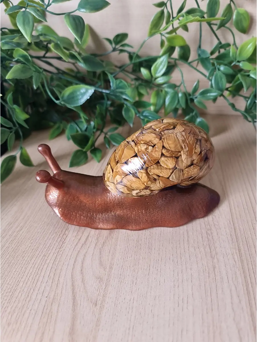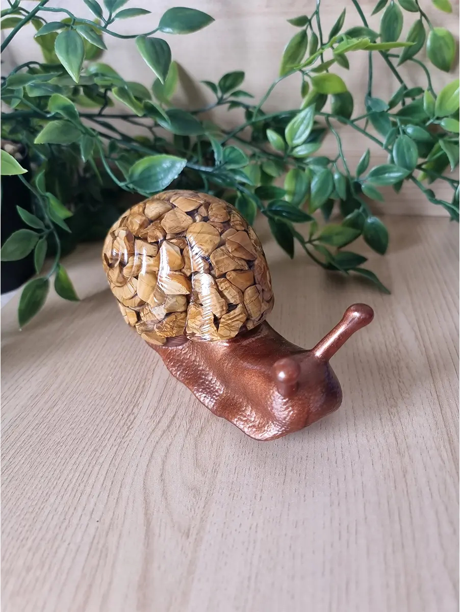 This stunning earth tone pebble resin snail is a beautiful fusion of artistry and nature. Crafted from high-quality resin and adorned with carefully selected pebbles, this snail features earth tone stones and brown resin, making it a striking addition to any space. Whether used as a decorative piece in your home or added to your collection of resin art, this handmade snail will stand out with its vibrant, unique design. The detailed craftsmanship ensures that each snail is one-of-a-kind, adding a personal touch to your decor. Ideal for nature lovers and art enthusiasts alike.