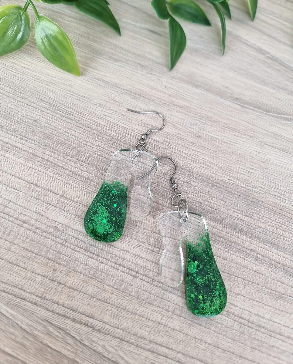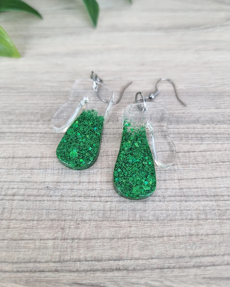 Elevate your style with these Green Glitter Chic Earrings, crafted from crystal clear resin and mixed with fine green glitter for a sophisticated, sparkling effect. The vibrant green glitter adds a bold pop of color, while the crystal-clear resin enhances the shimmer, creating a modern and eye-catching accessory. Their sleek design makes these earrings versatile enough to complement both casual and formal outfits.