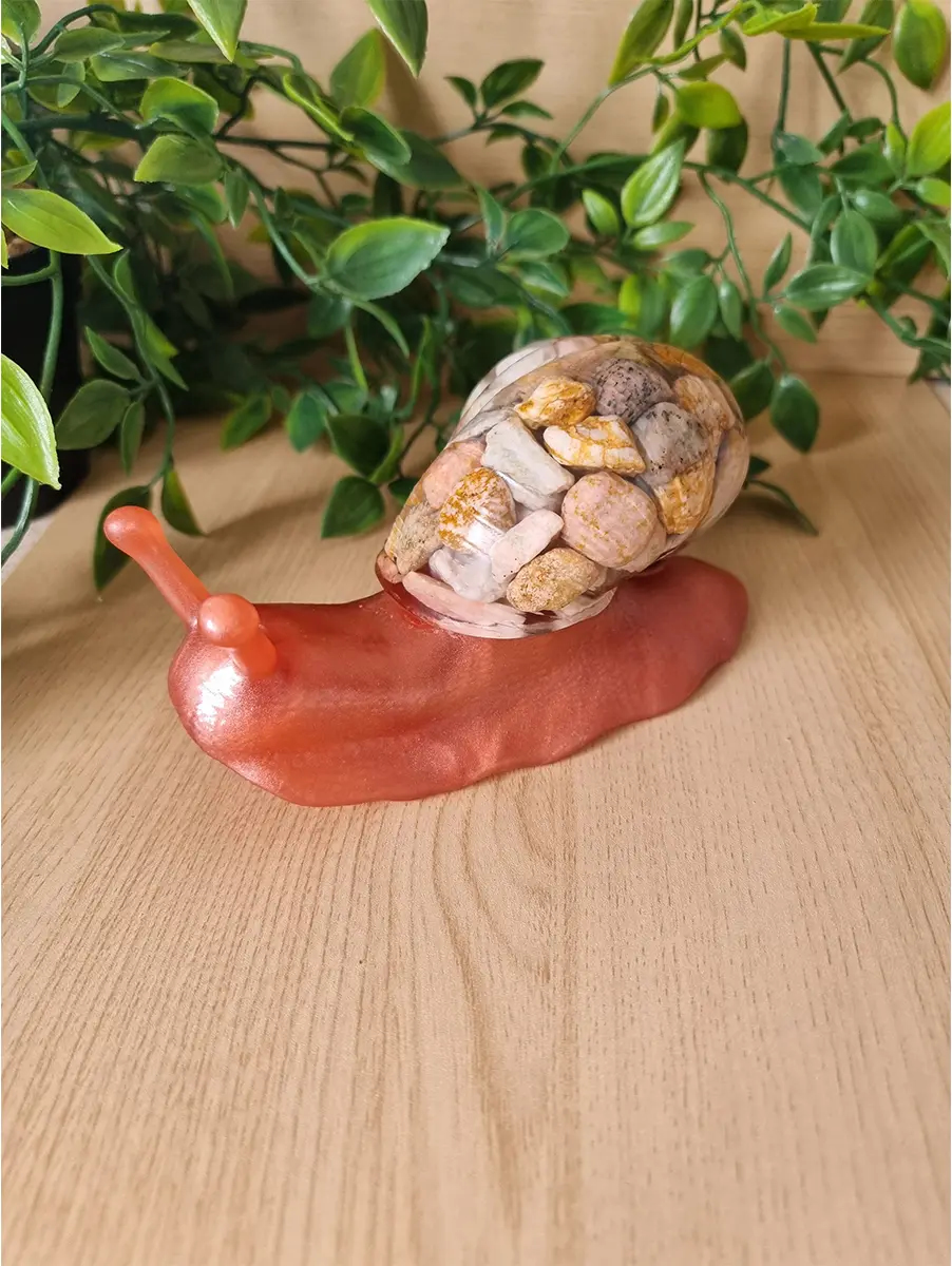 This stunning earth tone pebble resin snail is a beautiful fusion of artistry and nature. Crafted from high-quality resin and adorned with carefully selected pebbles, this snail features earth tone stones and brown resin, making it a striking addition to any space. Whether used as a decorative piece in your home or added to your collection of resin art, this handmade snail will stand out with its vibrant, unique design. The detailed craftsmanship ensures that each snail is one-of-a-kind, adding a personal touch to your decor. Ideal for nature lovers and art enthusiasts alike.