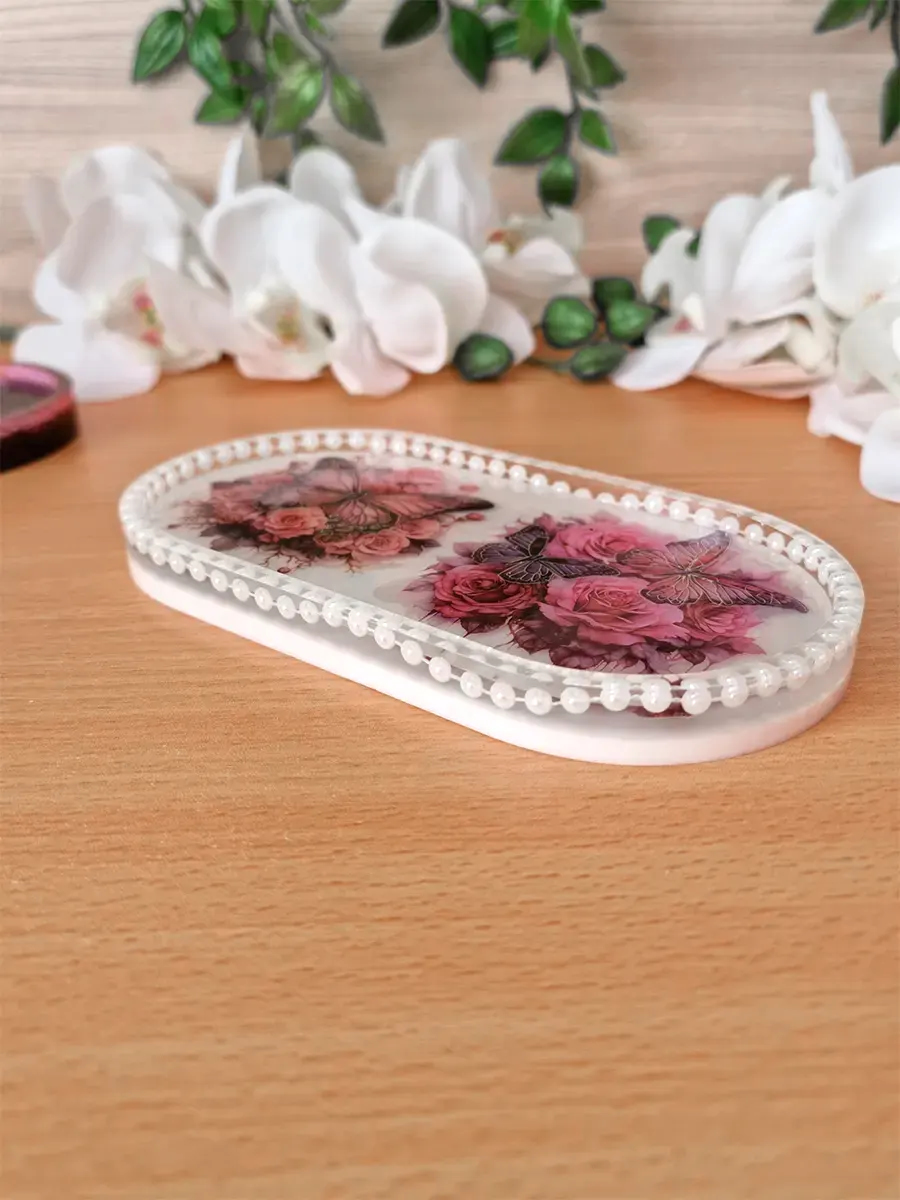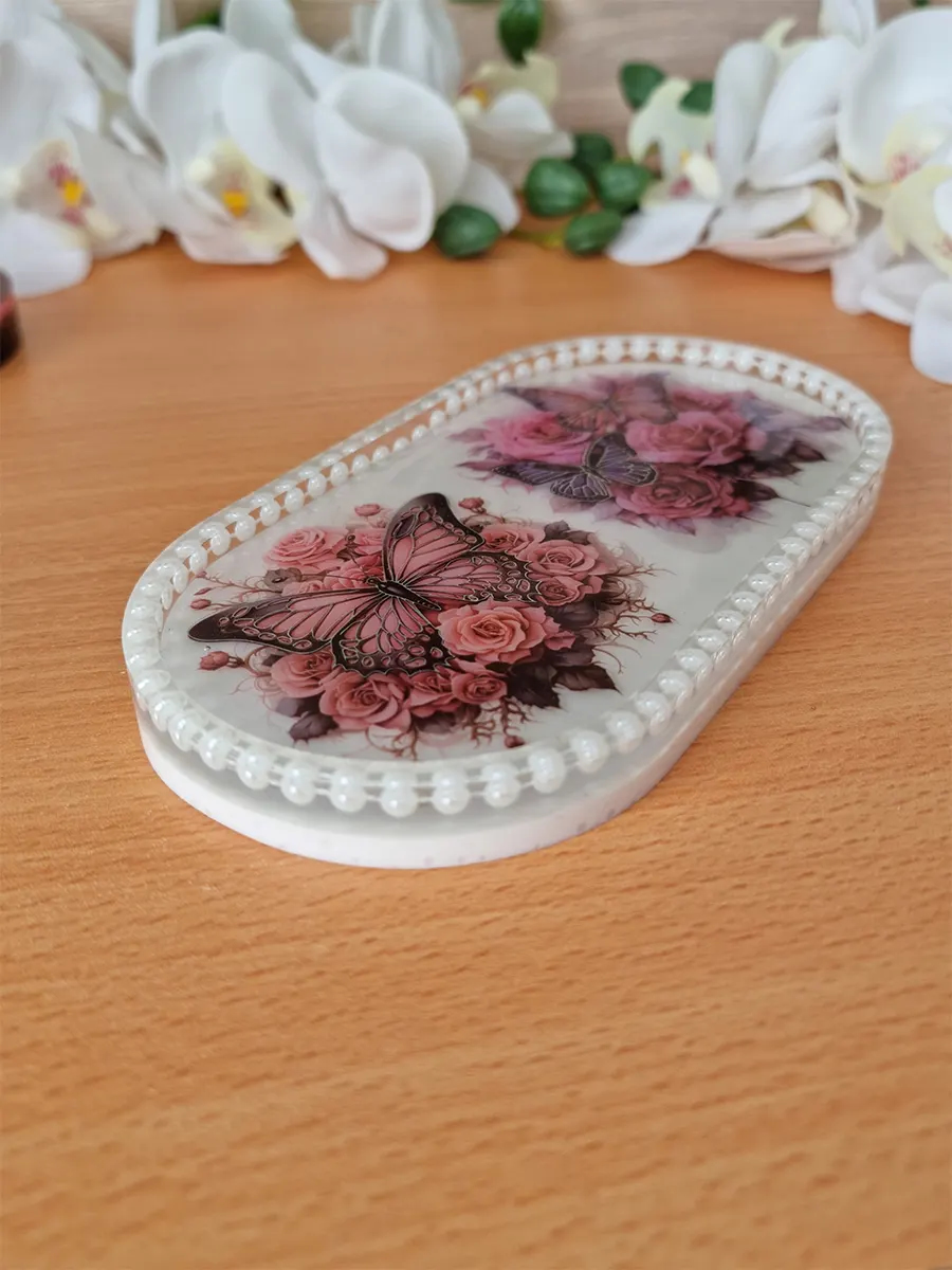 Bring nature’s elegance into your space with this handcrafted Flower & Butterfly White Resin Bead Oval Trinket Tray. Carefully poured in smooth white resin and beautifully detailed with pressed flowers, butterfly accents, and scattered pearl-like beads, this tray is a blend of charm and functionality.
