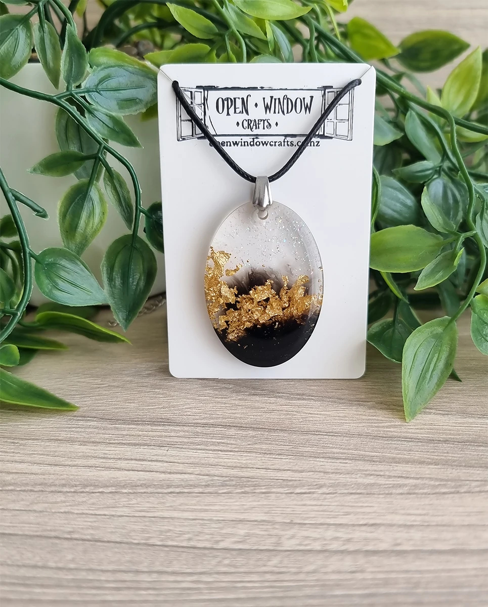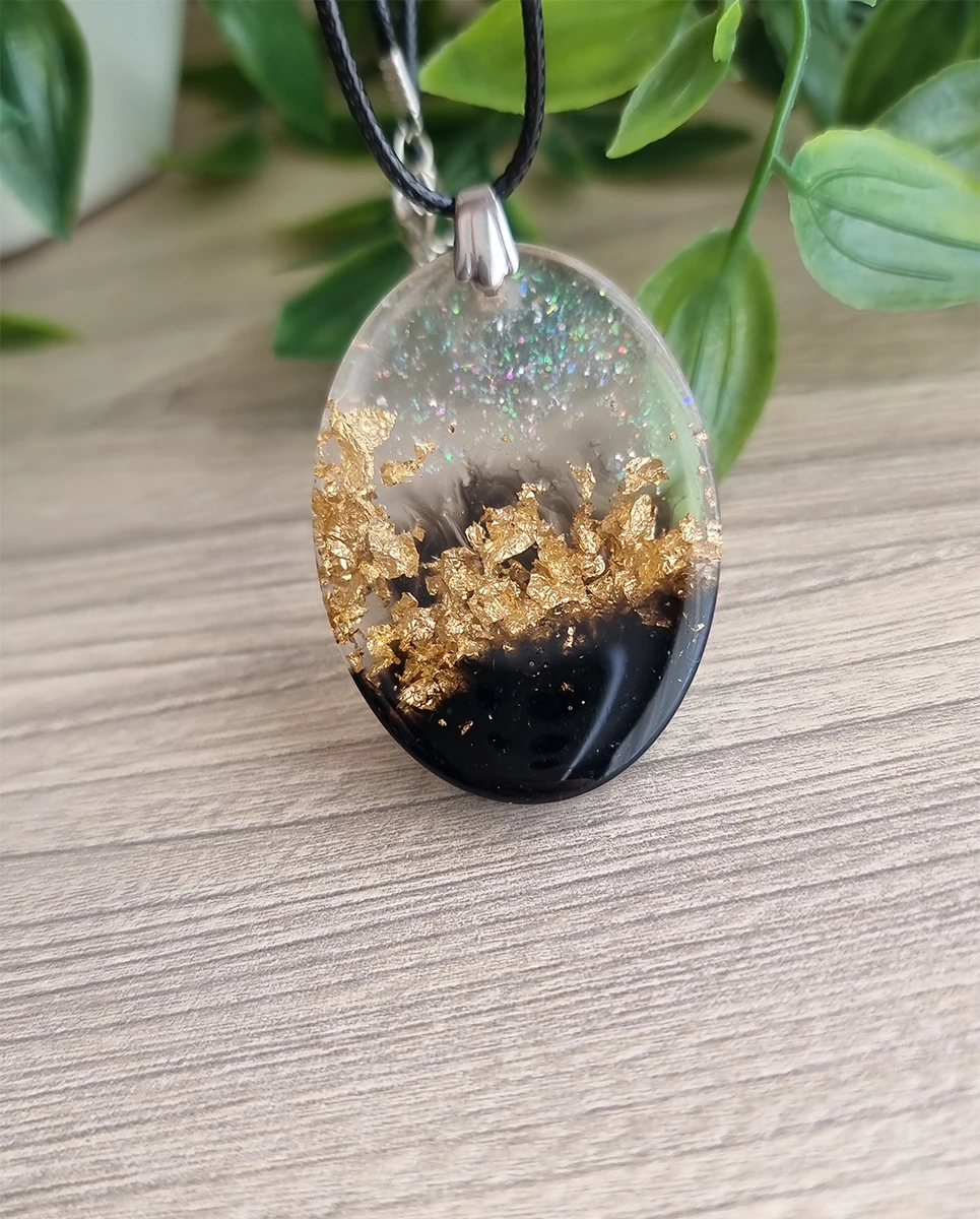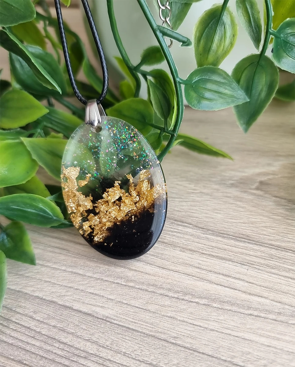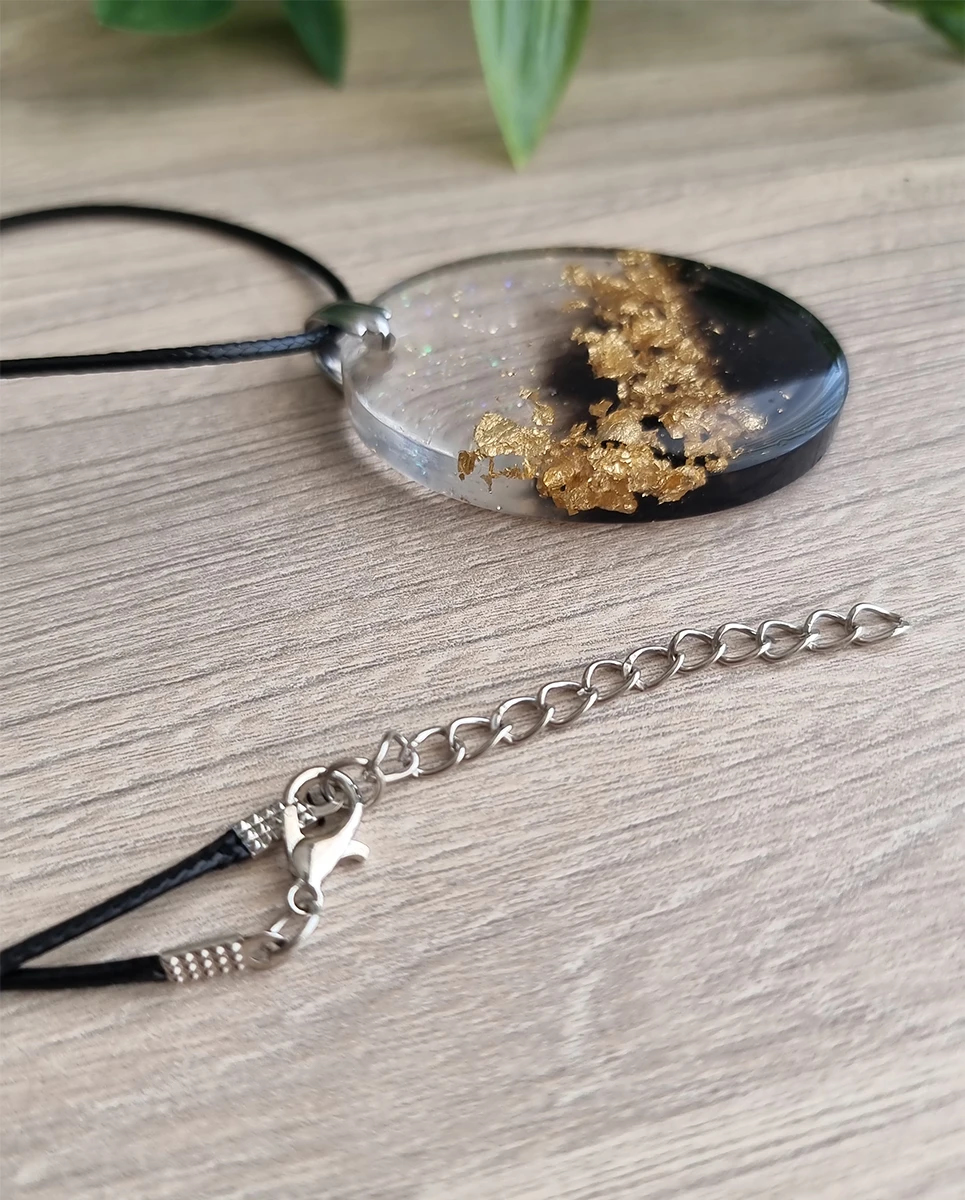 Unleash your inner sparkle with our handcrafted Gold Flake Necklace, a true masterpiece of creativity and craftsmanship. This stunning pendant features lustrous gold flakes artfully captured in smooth, high-clarity resin, offering a radiant glow that shifts with the light. Strung on a fine yet resilient chain, its featherlight design ensures all-day comfort while delivering a bold, sophisticated look. Every necklace is a unique work of art, shaped by hand to bring out its individual character—a perfect blend of modern minimalism and organic inspiration. Whether you’re treating yourself or gifting someone special, this necklace promises to be a cherished addition to any jewelry box.