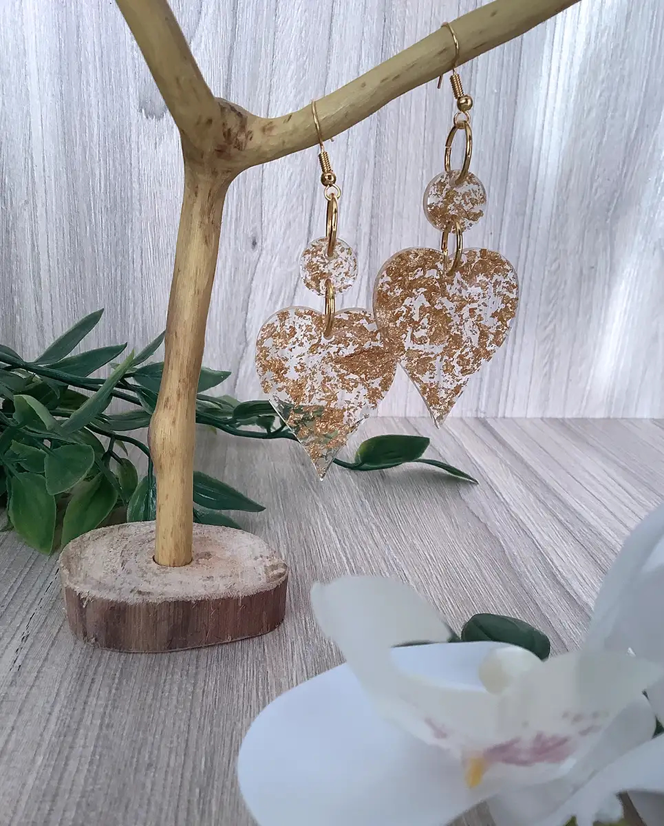 Gorgeous dangle earrings with gold flakes and resin in the shape of a heart.