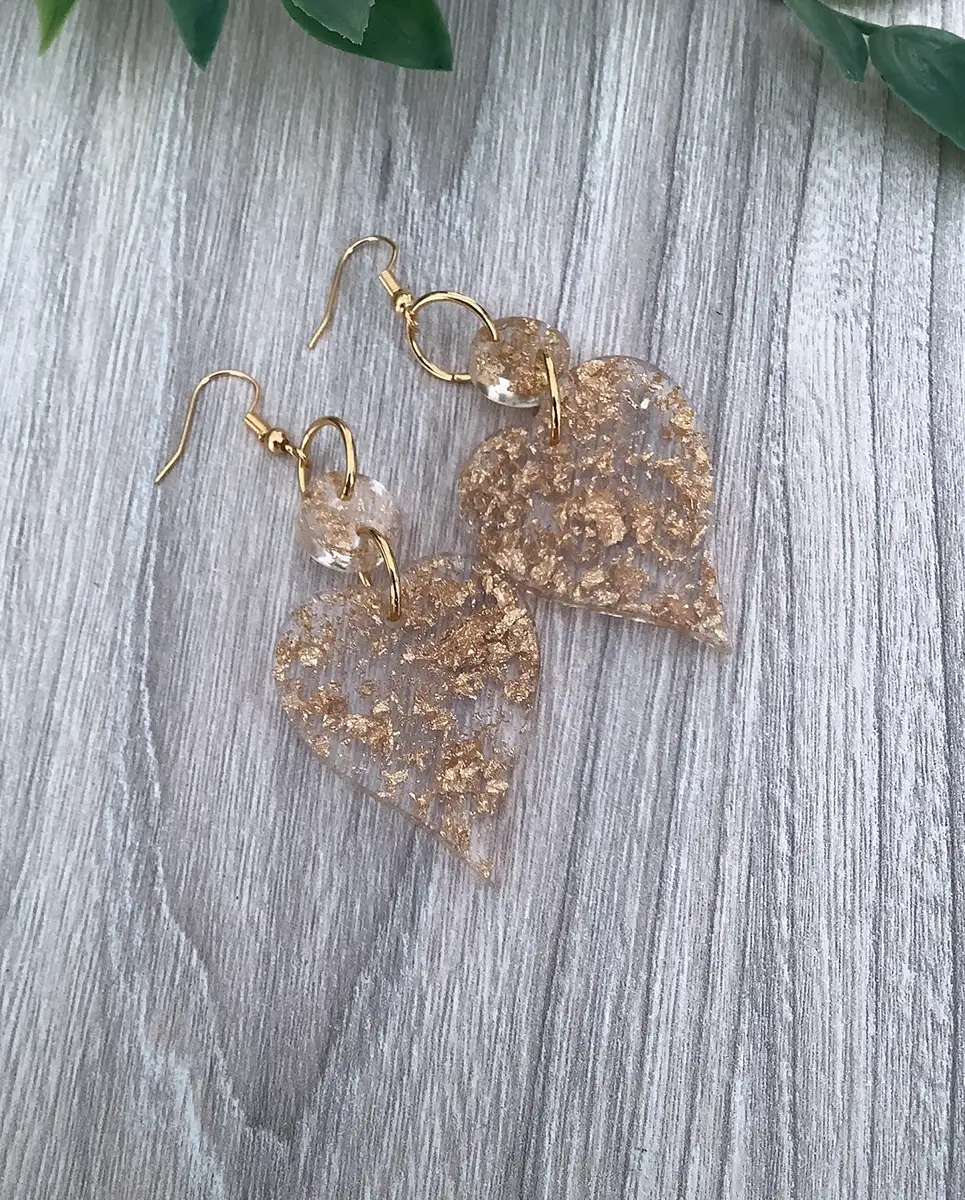Gold Flake Heart Resin Dangle Earrings – Gold Resin Earrings