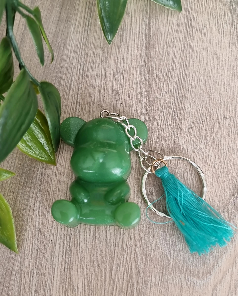 Add a touch of charm to your keys with this green resin bear Keychain. Its vibrant green color and cute bear design make it a playful and standout accessory.