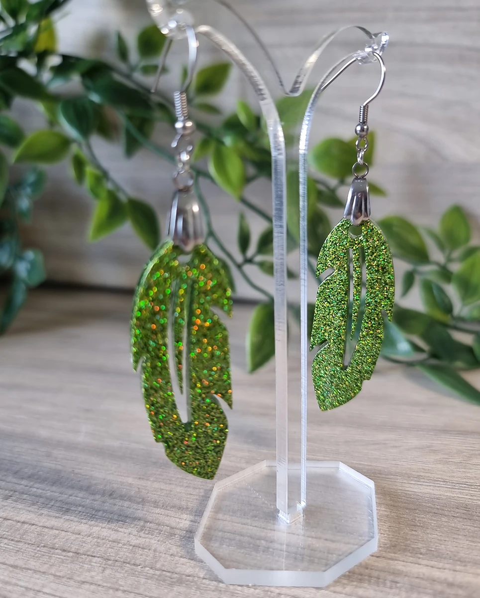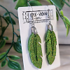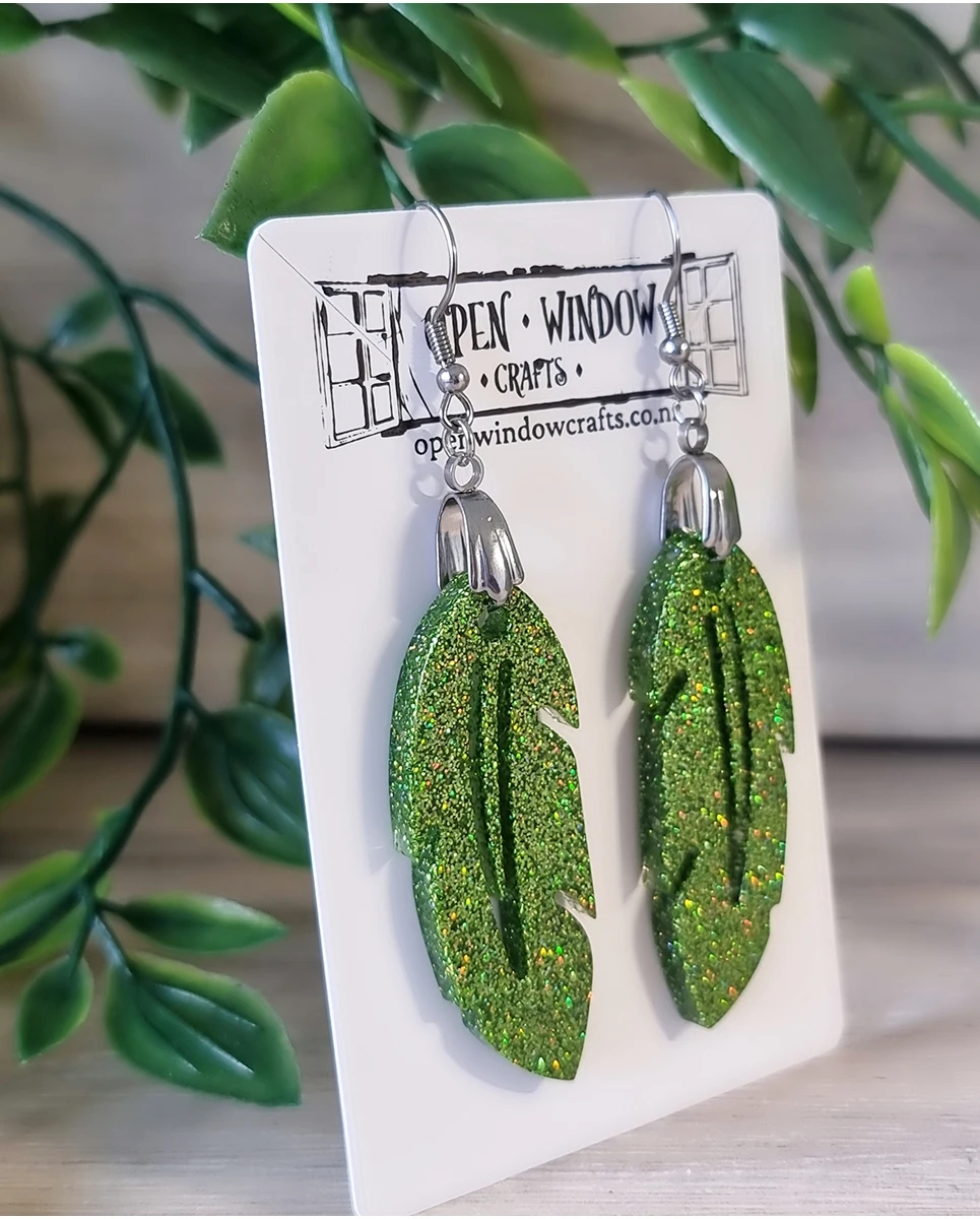 Add a pop of color and sparkle to your style with our Shimmering Green Feather Dangle Earrings! These elegant earrings feature a beautifully detailed feather design in vibrant green, enhanced with a touch of glitter for added sparkle. The lightweight dangle style adds graceful movement, making them perfect for both casual and formal occasions. Handcrafted from high-quality resin, they are comfortable to wear all day, adding a unique and dazzling flair to any outfit.