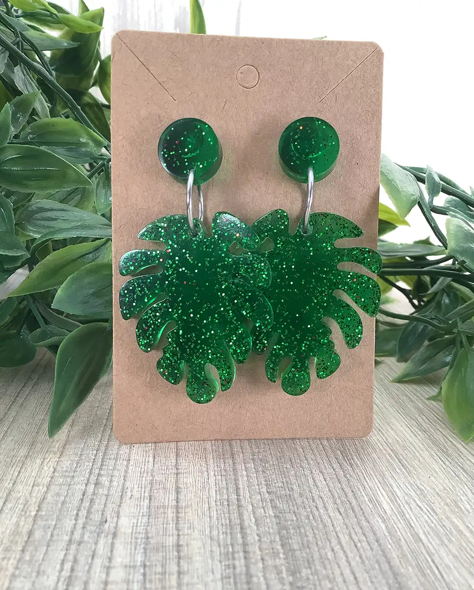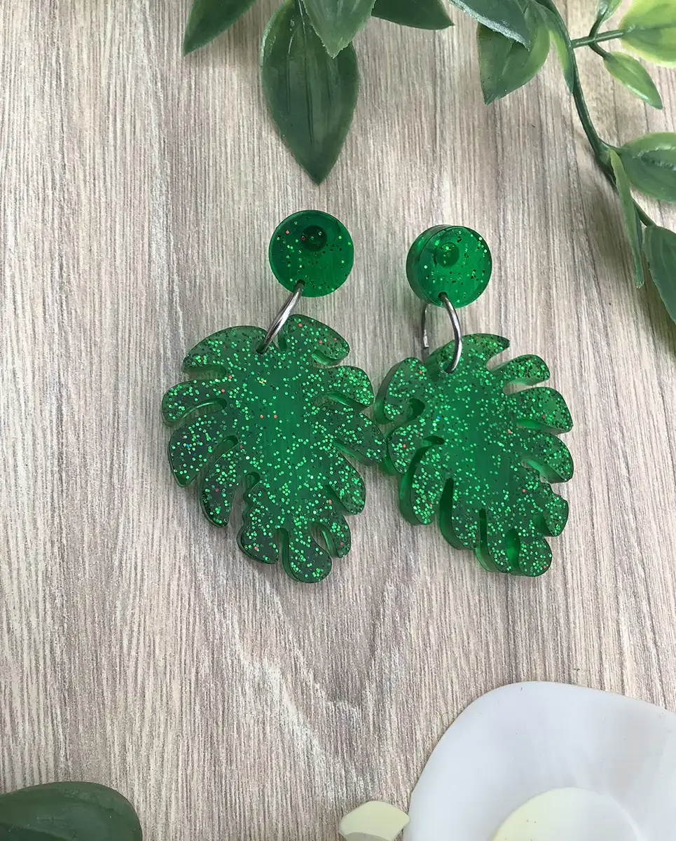Bring a touch of nature-inspired elegance to your jewelry collection with the Green Glitter Monstera Leaf Earrings. These beautifully crafted earrings feature a detailed Monstera leaf design, made from high-quality resin in a vibrant green shade. The tropical-inspired shape adds a bold and trendy flair to your look, perfect for anyone who loves unique and statement accessories.