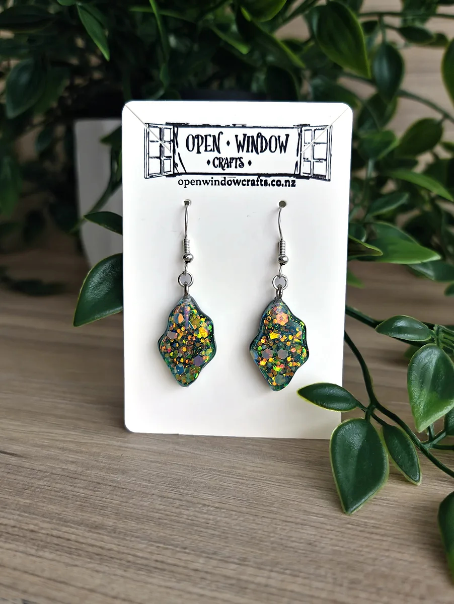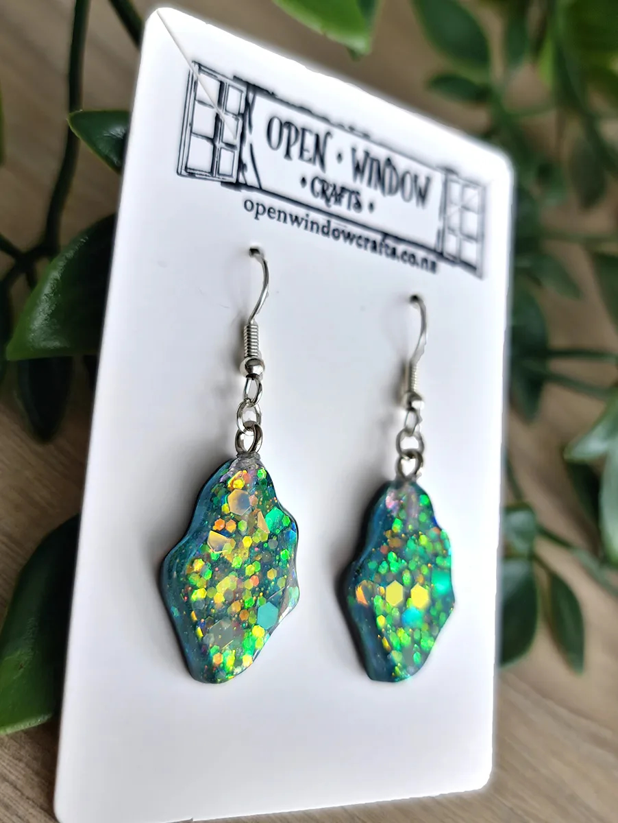 🌟 Shine bright with our Irregular Sparkle Shimmer Glitter Dangle Earrings! Handmade in New Zealand 🇳🇿 with glittering resin for a lightweight, dazzling finish. ✨