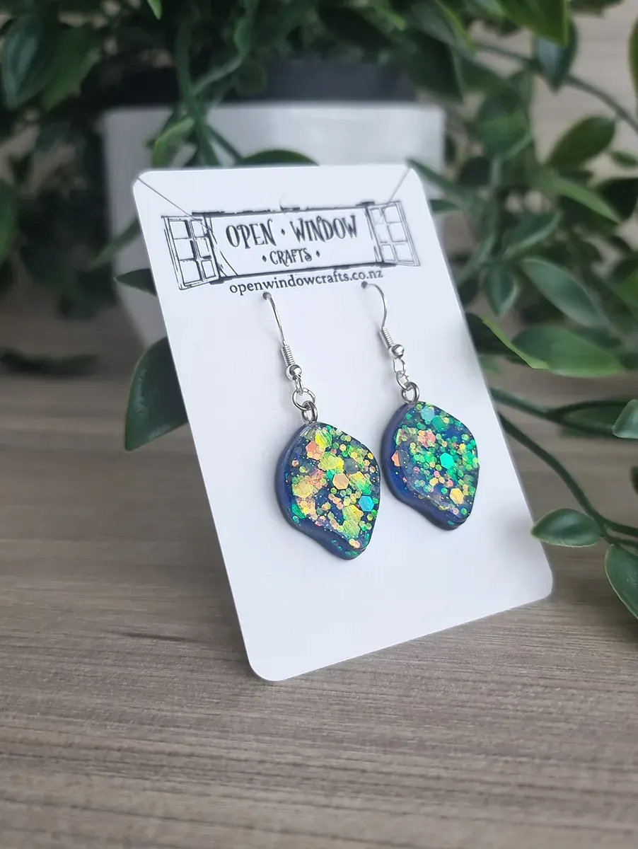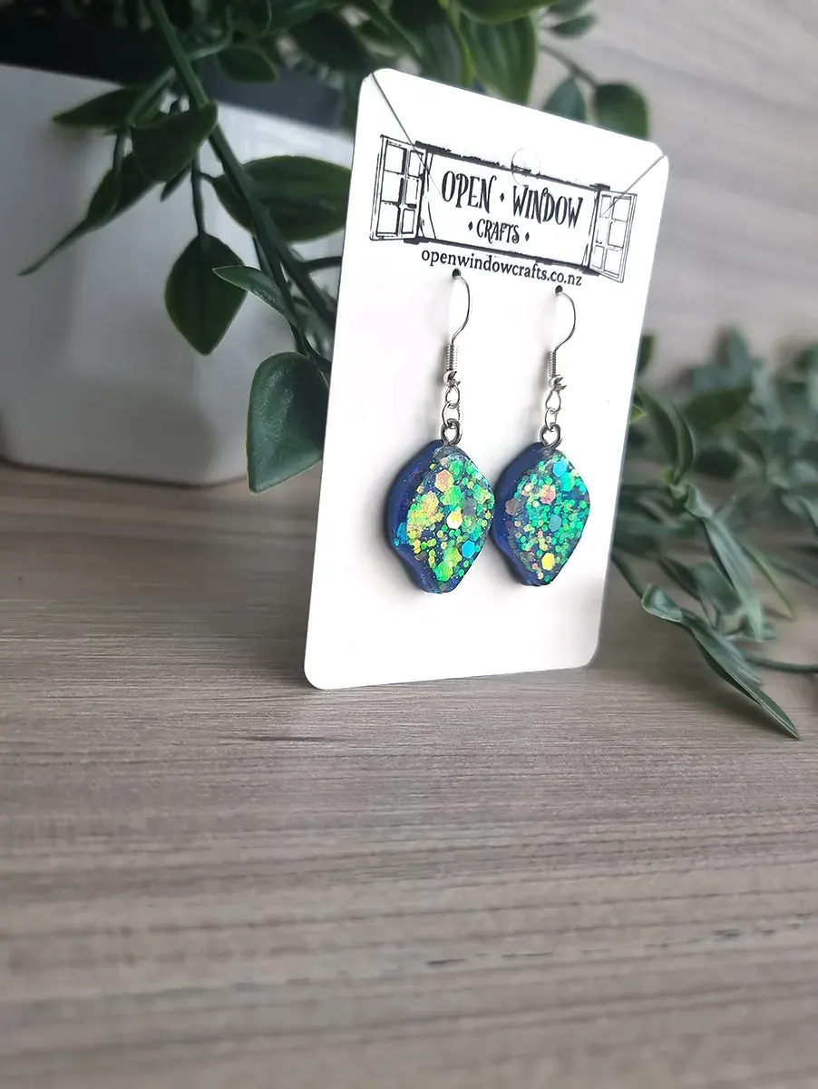 ✨ Light up your look with our Irregular Sparkle Shimmer Glitter Dangle Earrings! Handmade in New Zealand 🇳🇿, these glittery resin beauties are bold, bright, and lightweight. 🎉