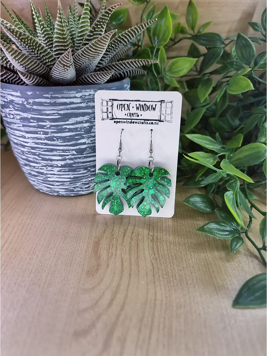 Gorgeous Monstera leaf dangle earrings with green glitter.