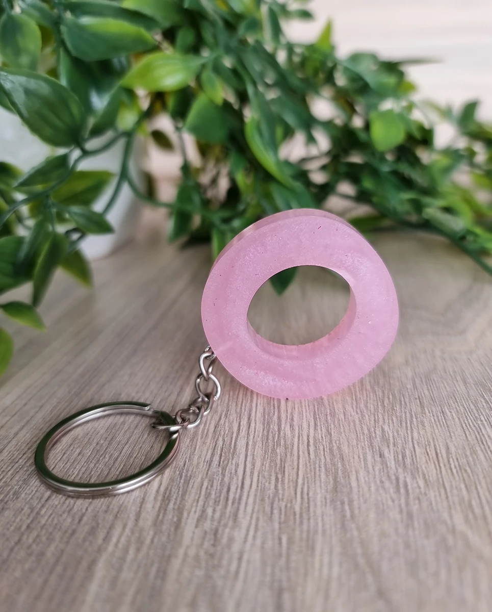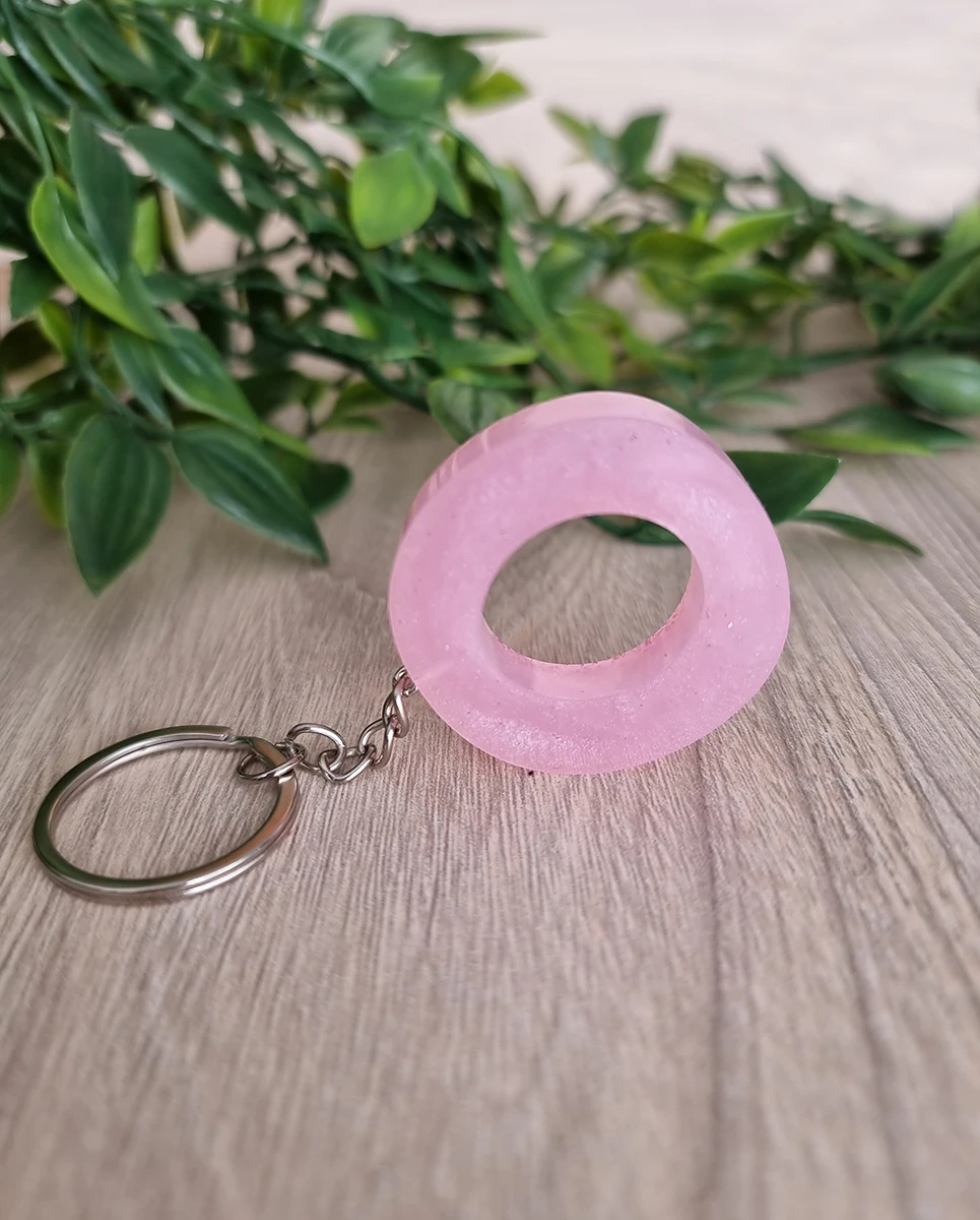 Elevate your style with this pink resin Keychain, featuring a glittery back for an extra touch of sparkle. It’s a chic and playful accessory that adds a pop of fun to your keys.