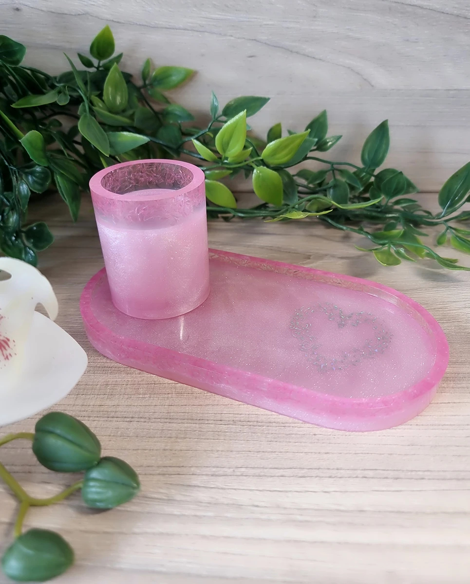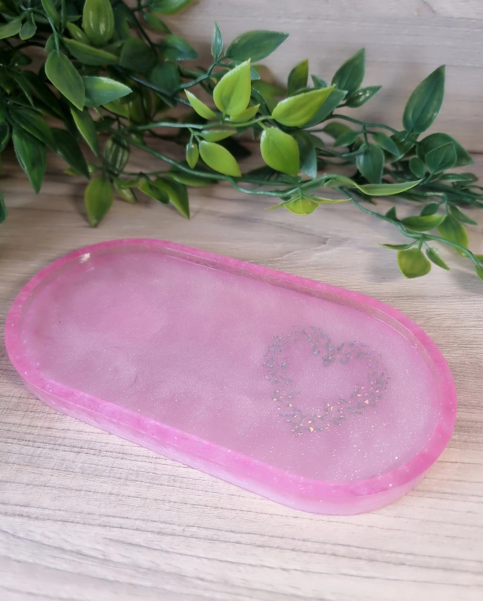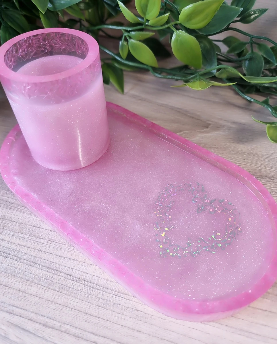 Pink Resin Holographic Heart Trinket Tray And Cup