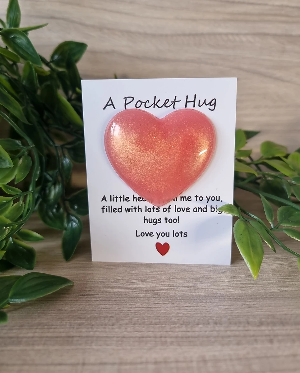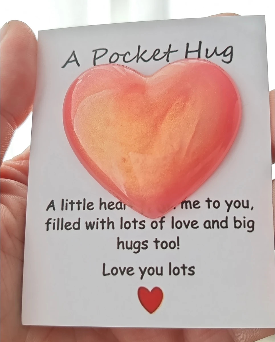 This Pink and Yellow Shimmer Resin Pocket Hug Heart is a charming way to send love and comfort. Made with shimmering resin, it fits perfectly in a pocket or purse, offering a sweet reminder that someone cares.