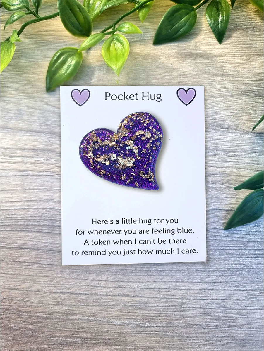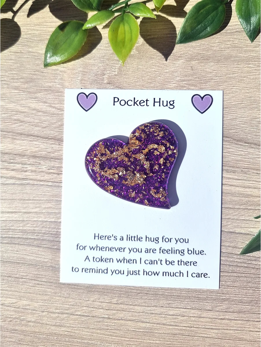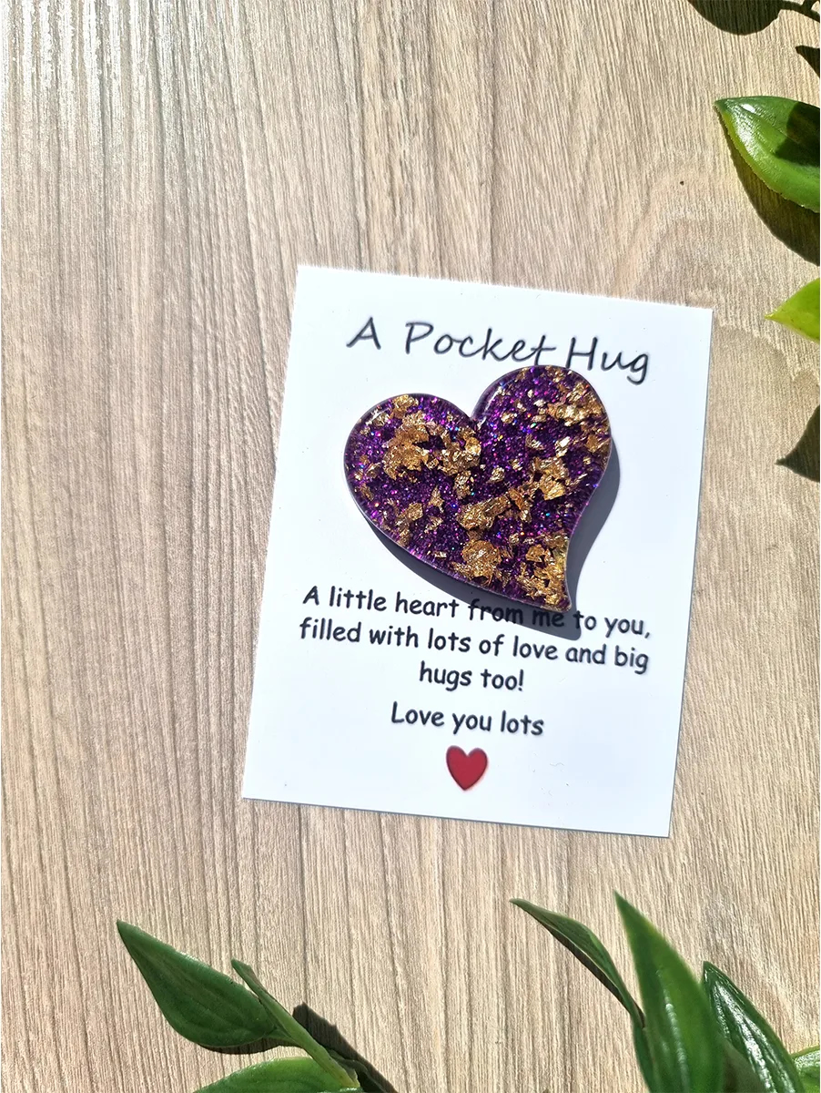 Carry love and warmth in your pocket with the Purple Glitter Gold Flake Resin Pocket Hug – a perfect way to share positive vibes!