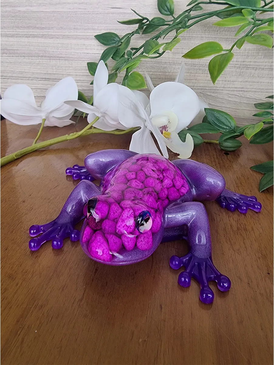 Brighten up your home or garden with this stunning handcrafted resin frog, a perfect blend of artistry and nature-inspired design. Each frog is meticulously crafted using high-quality, low-viscosity resin, available in a variety of dazzling colors, including metallic, chameleon, and glitter-infused finishes. Embedded with assorted color pebbles, this charming piece reflects light beautifully, creating a captivating effect that enhances any setting.