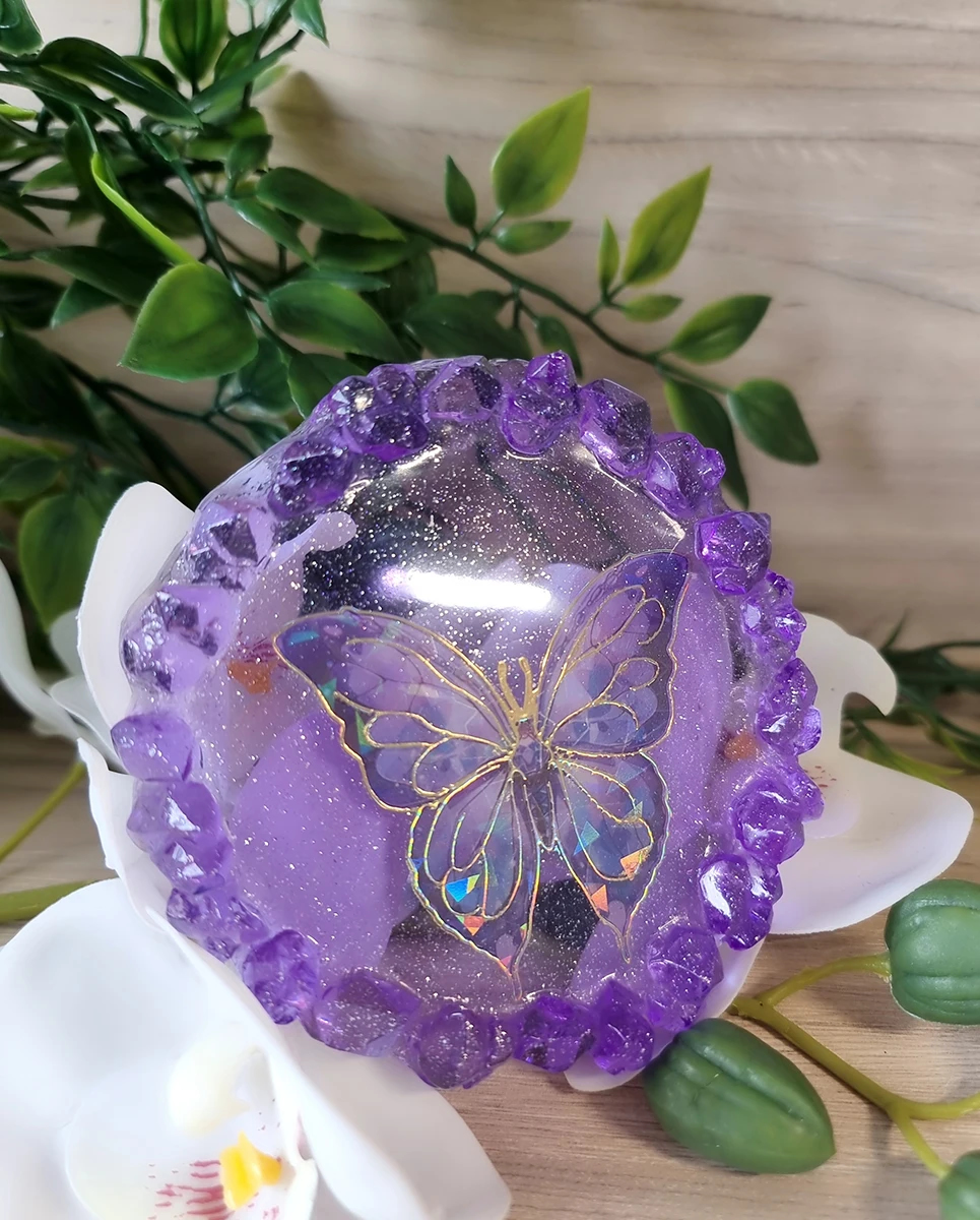 Store your small treasures in style with this stunning Purple Glitter Holographic Butterfly Resin Trinket Dish. Featuring a captivating holographic finish and shimmering purple glitter, it’s the perfect blend of beauty and function for your space.