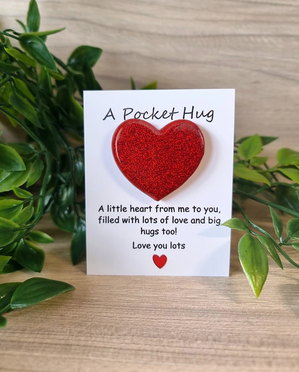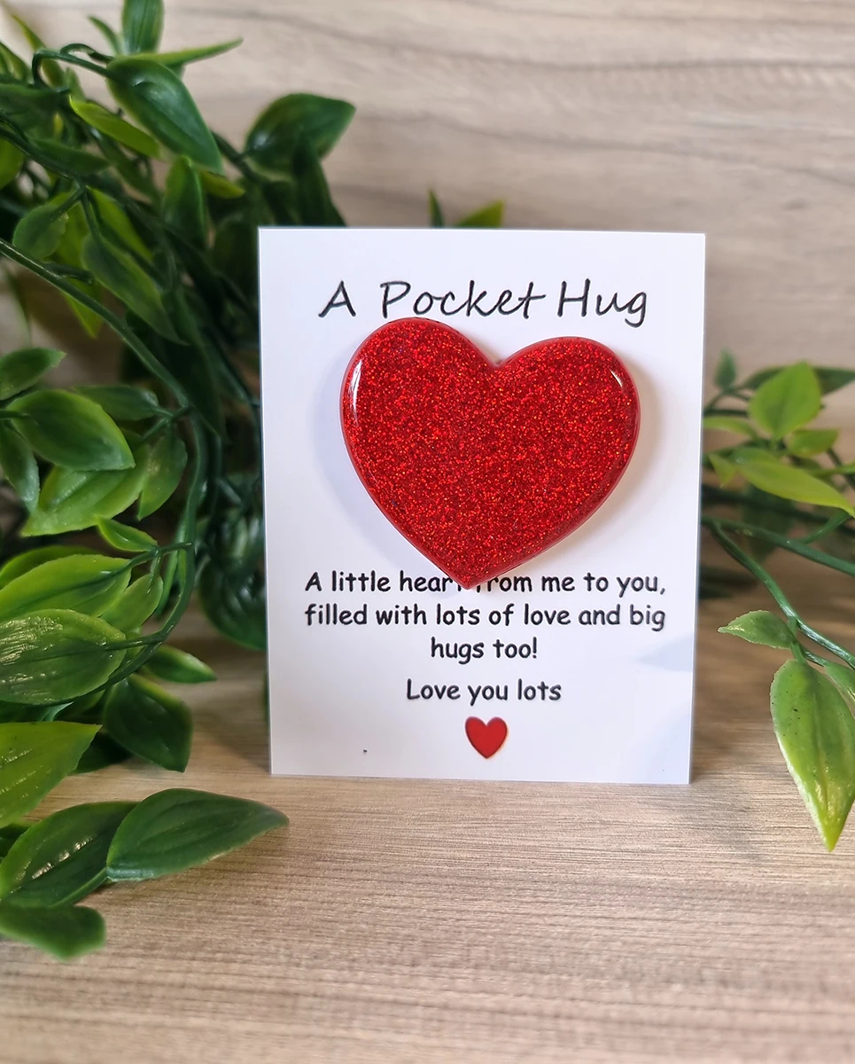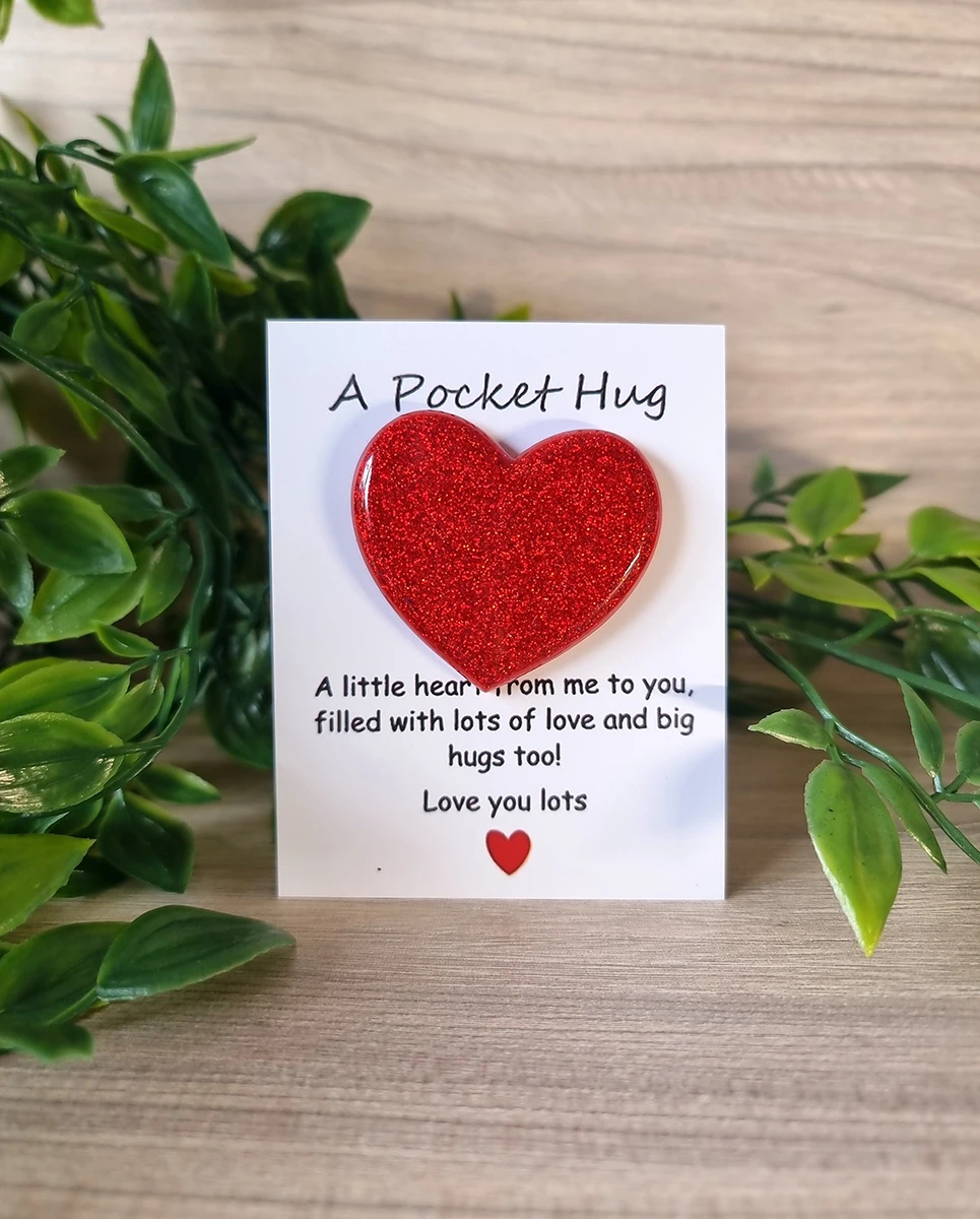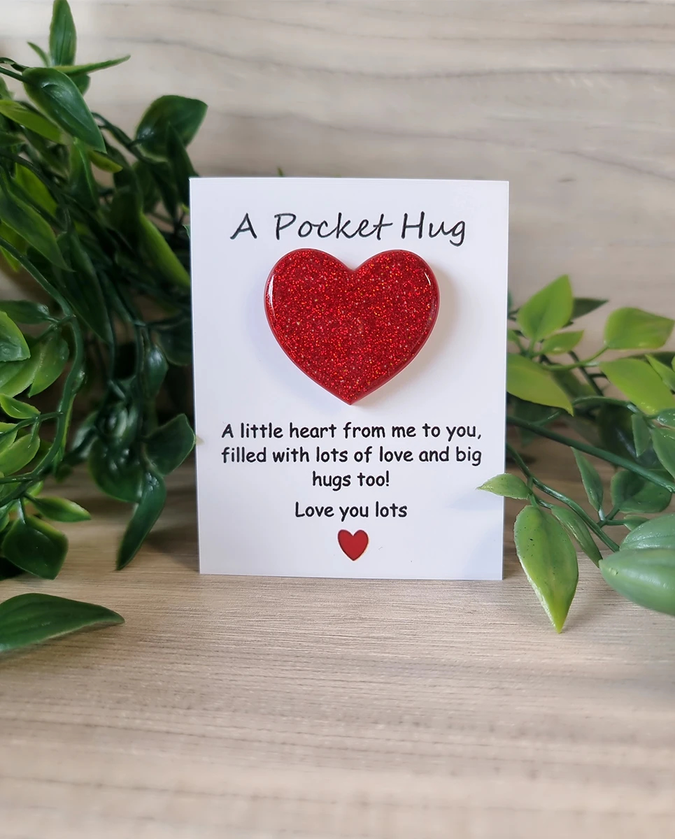These Red Resin Glitter Pocket Hug Hearts are the perfect way to send a little love and comfort to someone special. Made from high-quality resin, each heart is infused with vibrant red glitter for a beautiful sparkle. Small enough to fit in a pocket, wallet, or purse, these hearts serve as a sweet reminder that someone is always thinking of you. Whether it’s for a friend, family member, or loved one, these charming keepsakes are a thoughtful and meaningful gift.