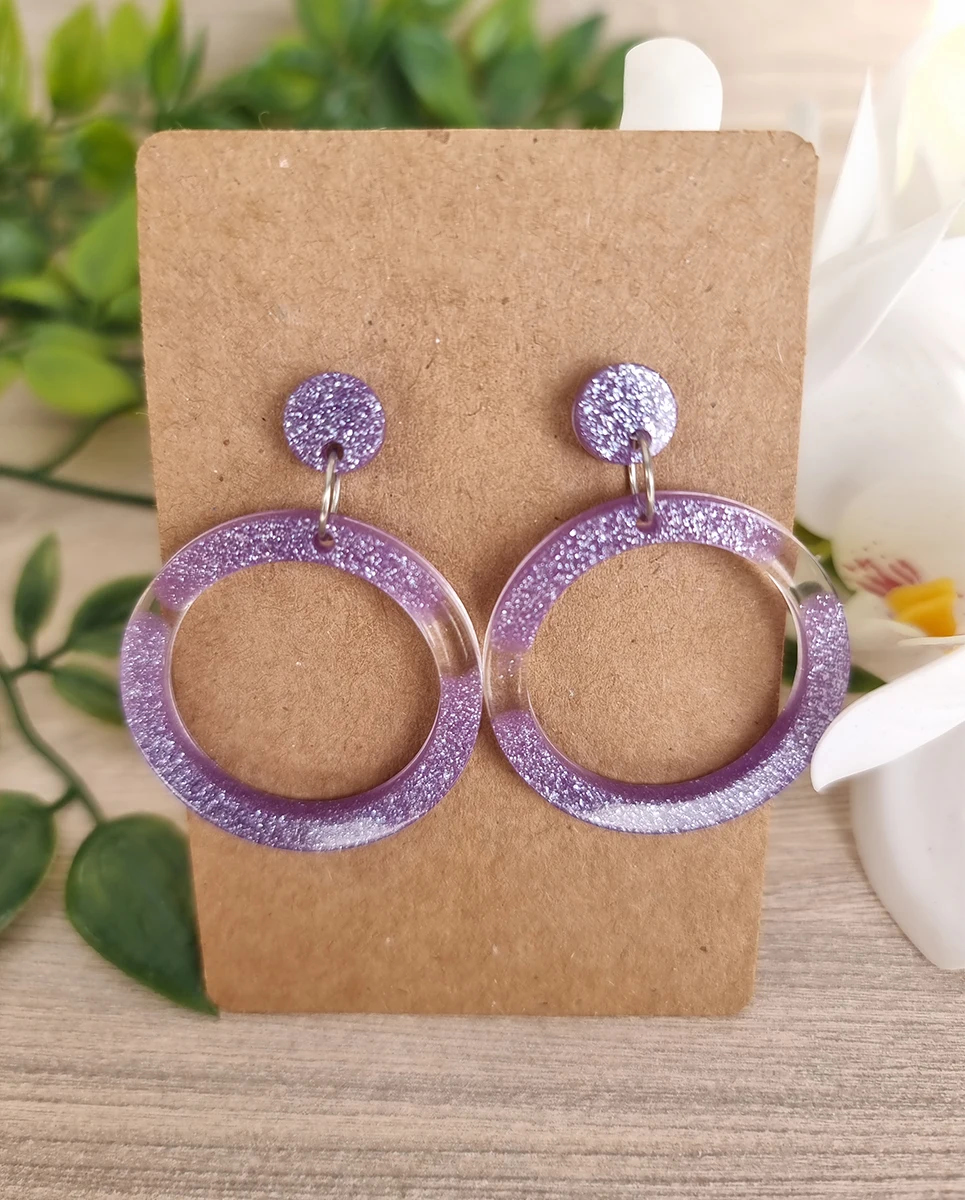 Lightweight and designed for comfort, these earrings are ideal for all-day wear, effortlessly transitioning from day to night. The combination of vibrant purple, clear resin, and glitter gives them a chic, contemporary style that complements a variety of outfits, from casual to formal.