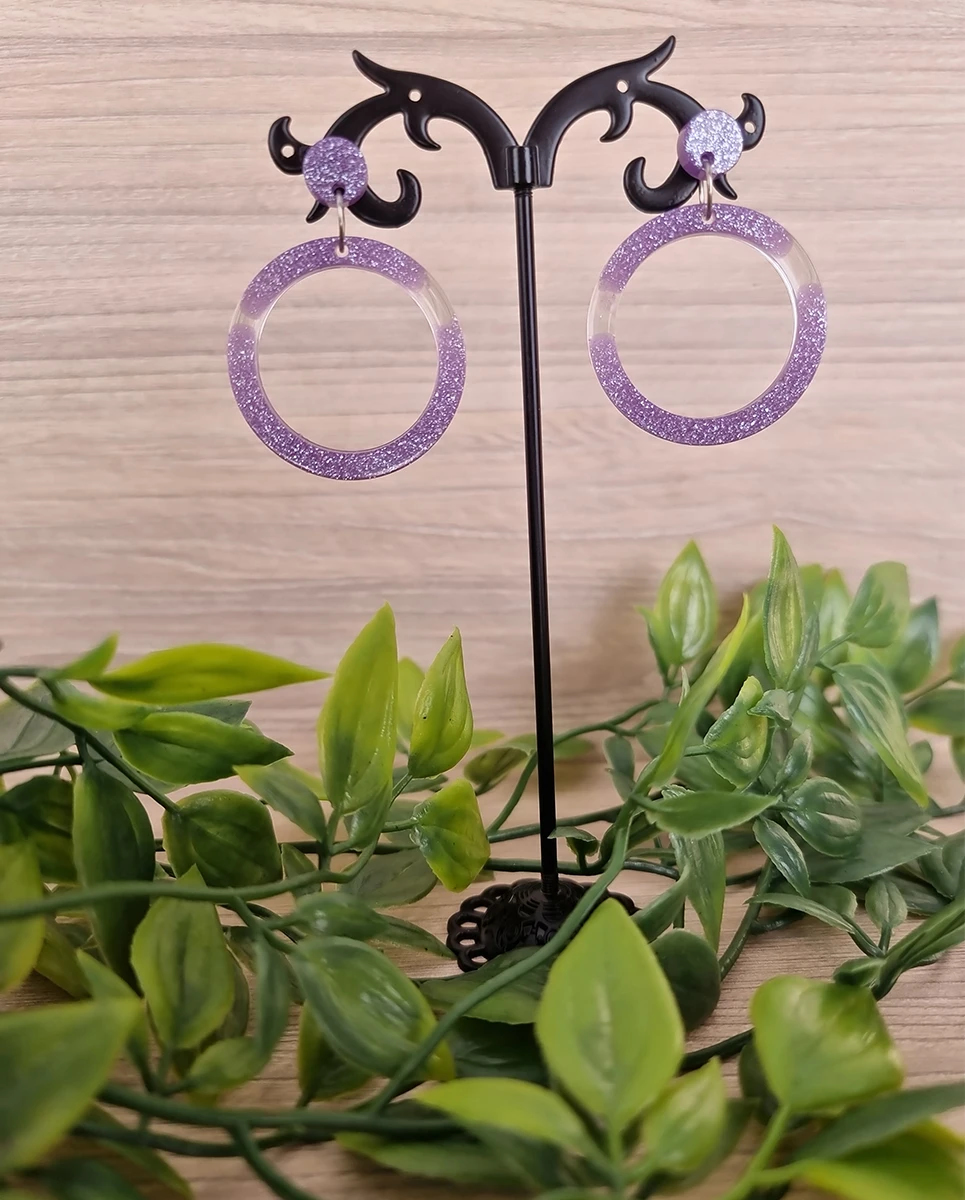 Step up your accessory game with these Round Purple and Resin Earrings, featuring a stunning mix of crystal clear resin and fine glitter for a subtle shimmer. The purple hue paired with the clear resin creates a striking, modern look, while the fine glitter adds a touch of sparkle that catches the light beautifully. These earrings are perfect for adding a hint of elegance and glamour to any outfit, whether you’re dressing up for a special occasion or adding a stylish twist to your everyday wear.
