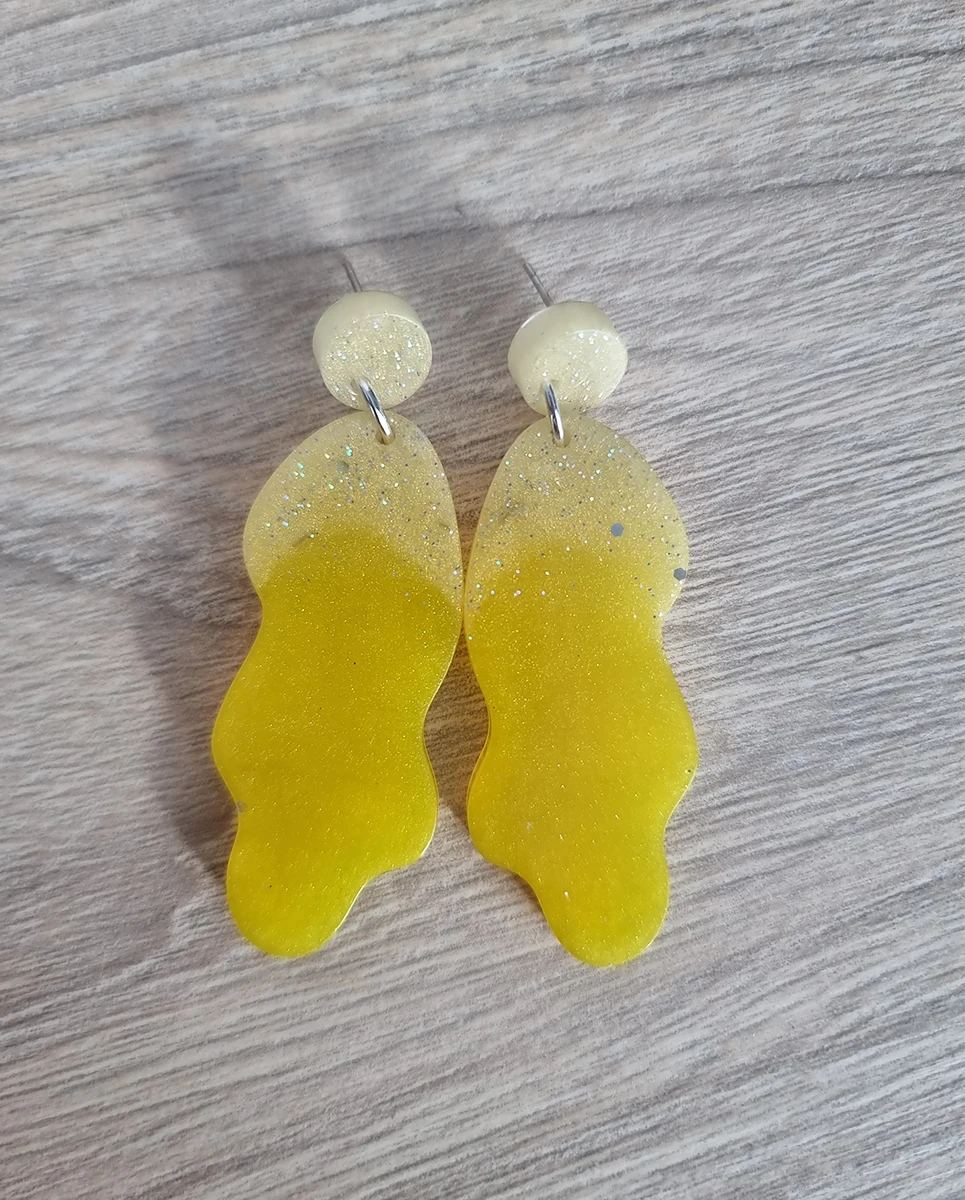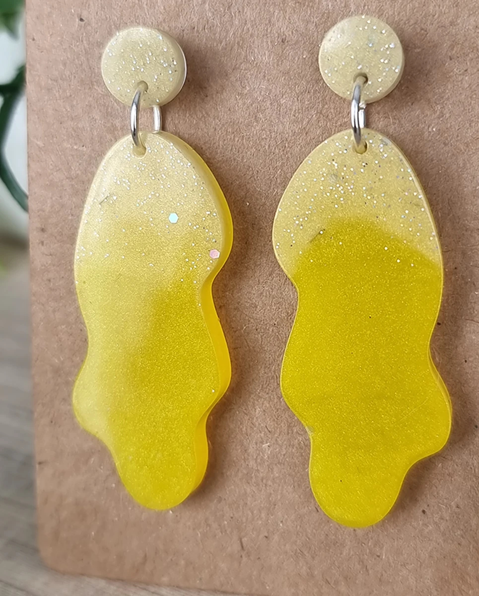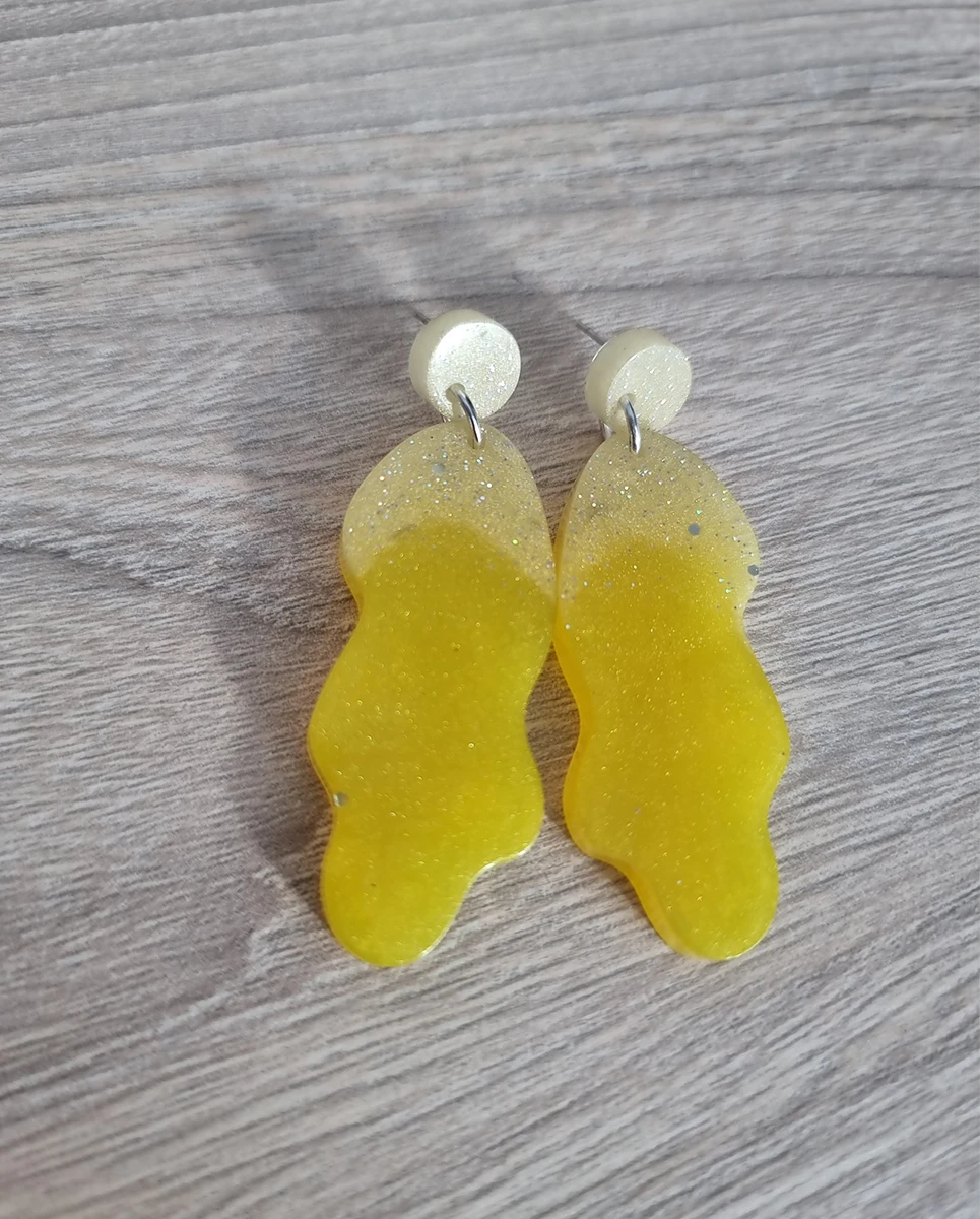 • Irregular dangle design with vibrant yellow and glitter accents